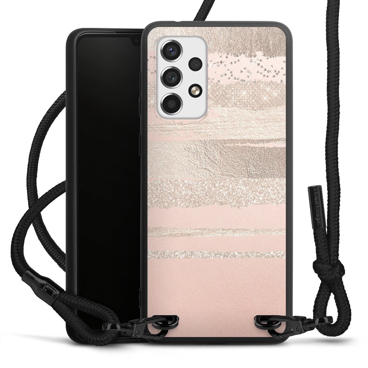 The matt black silicone case is made of flexible TPU (thermoplastic polyurethane) and offers robust protection. The durable, unbreakable material makes the cover flexible and dimensionally stable at the same time. The matte surface makes your design stand out more and is less susceptible to fingerprints and dirt. The stylish trend accessory fits comfortably in the hand and is perfectly complemented by the fabric (polyester) mobile phone strap. The braided fabric strap is approx. 1.70 metres long with a diameter of approx. 0.5 cm. Due to the special knotting technique, the length of the strap can be adjusted by simply pulling it, so that you can adapt it individually to your wishes. The practical case to wear around your neck is available with the fabric strap in black. As a little icing on the cake, we have provided the strap with a chic metal fastener in matt black. The strap is securely fastened to the case with loops made of high-quality genuine leather and press studs. The ends of the fabric strap are covered with metallic end caps and thus protected from fraying.