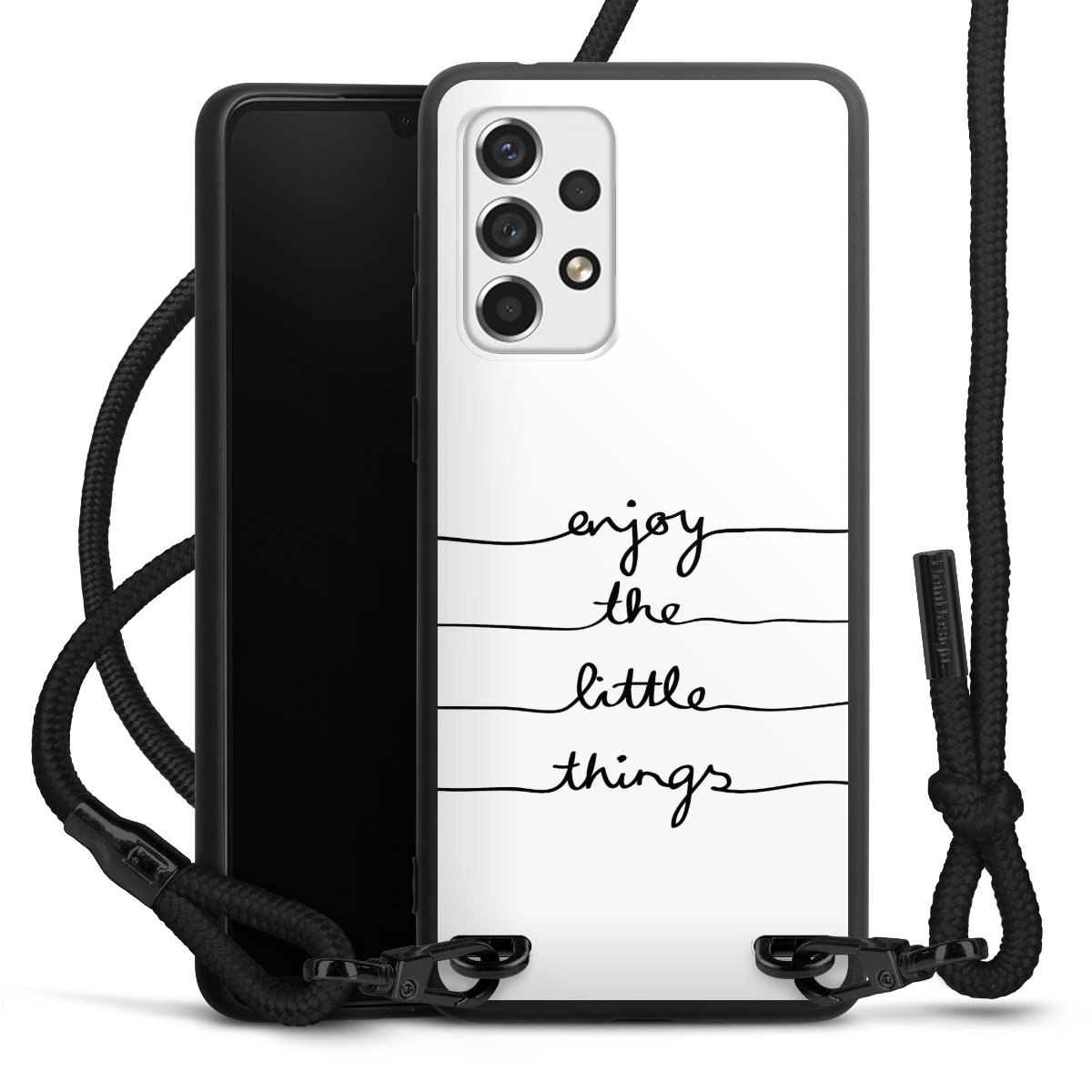 The matt black silicone case is made of flexible TPU (thermoplastic polyurethane) and offers robust protection. The durable, unbreakable material makes the cover flexible and dimensionally stable at the same time. The matte surface makes your design stand out more and is less susceptible to fingerprints and dirt. The stylish trend accessory fits comfortably in the hand and is perfectly complemented by the fabric (polyester) mobile phone strap. The braided fabric strap is approx. 1.70 metres long with a diameter of approx. 0.5 cm. Due to the special knotting technique, the length of the strap can be adjusted by simply pulling it, so that you can adapt it individually to your wishes. The practical case to wear around your neck is available with the fabric strap in black. As a little icing on the cake, we have provided the strap with a chic metal fastener in matt black. The strap is securely fastened to the case with loops made of high-quality genuine leather and press studs. The ends of the fabric strap are covered with metallic end caps and thus protected from fraying.
