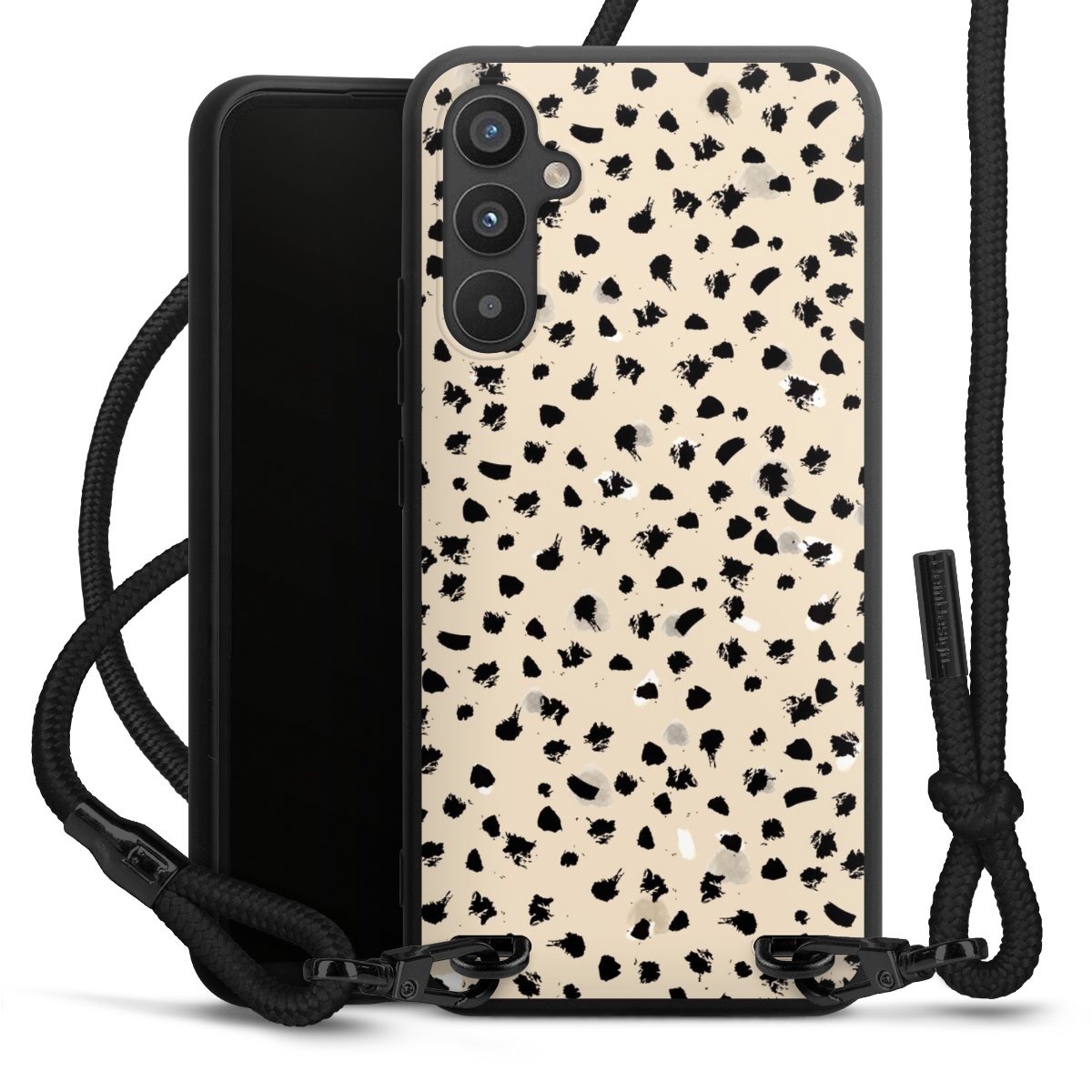 The matt black silicone case is made of flexible TPU (thermoplastic polyurethane) and offers robust protection. The durable, unbreakable material makes the cover flexible and dimensionally stable at the same time. The matte surface makes your design stand out more and is less susceptible to fingerprints and dirt. The stylish trend accessory fits comfortably in the hand and is perfectly complemented by the fabric (polyester) mobile phone strap. The braided fabric strap is approx. 1.70 metres long with a diameter of approx. 0.5 cm. Due to the special knotting technique, the length of the strap can be adjusted by simply pulling it, so that you can adapt it individually to your wishes. The practical case to wear around your neck is available with the fabric strap in black. As a little icing on the cake, we have provided the strap with a chic metal fastener in matt black. The strap is securely fastened to the case with loops made of high-quality genuine leather and press studs. The ends of the fabric strap are covered with metallic end caps and thus protected from fraying.
