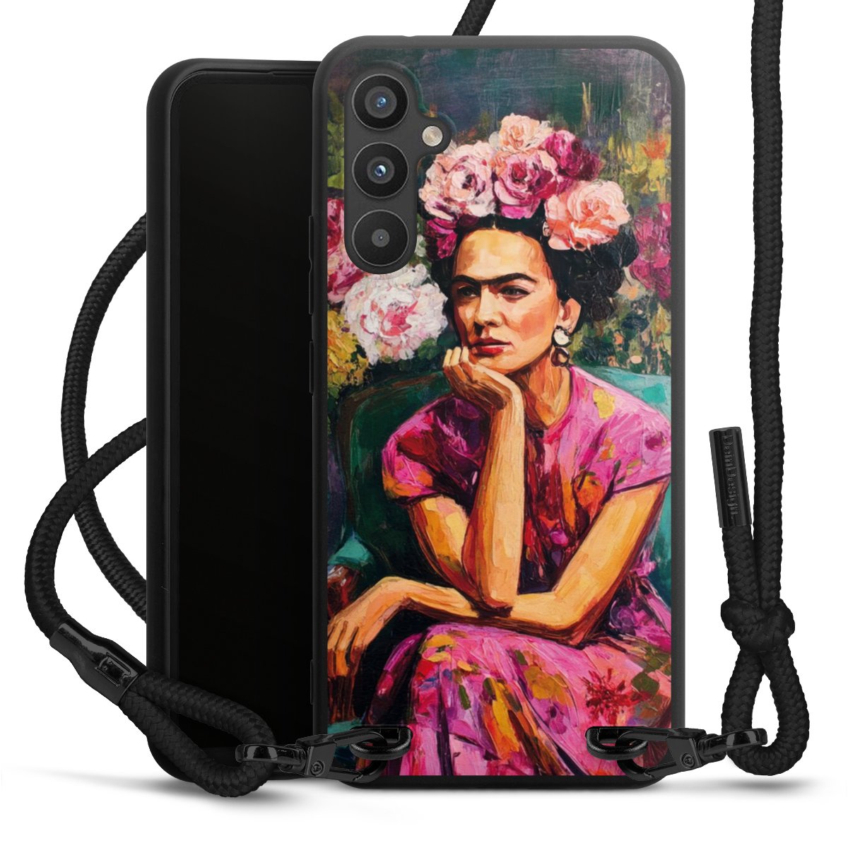 The matt black silicone case is made of flexible TPU (thermoplastic polyurethane) and offers robust protection. The durable, unbreakable material makes the cover flexible and dimensionally stable at the same time. The matte surface makes your design stand out more and is less susceptible to fingerprints and dirt. The stylish trend accessory fits comfortably in the hand and is perfectly complemented by the fabric (polyester) mobile phone strap. The braided fabric strap is approx. 1.70 metres long with a diameter of approx. 0.5 cm. Due to the special knotting technique, the length of the strap can be adjusted by simply pulling it, so that you can adapt it individually to your wishes. The practical case to wear around your neck is available with the fabric strap in black. As a little icing on the cake, we have provided the strap with a chic metal fastener in matt black. The strap is securely fastened to the case with loops made of high-quality genuine leather and press studs. The ends of the fabric strap are covered with metallic end caps and thus protected from fraying.