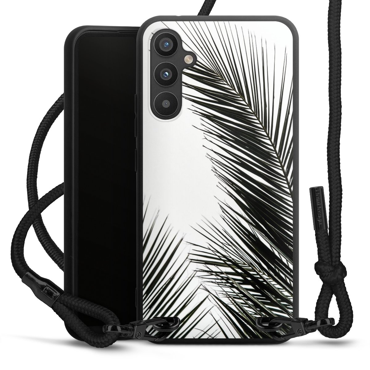The matt black silicone case is made of flexible TPU (thermoplastic polyurethane) and offers robust protection. The durable, unbreakable material makes the cover flexible and dimensionally stable at the same time. The matte surface makes your design stand out more and is less susceptible to fingerprints and dirt. The stylish trend accessory fits comfortably in the hand and is perfectly complemented by the fabric (polyester) mobile phone strap. The braided fabric strap is approx. 1.70 metres long with a diameter of approx. 0.5 cm. Due to the special knotting technique, the length of the strap can be adjusted by simply pulling it, so that you can adapt it individually to your wishes. The practical case to wear around your neck is available with the fabric strap in black. As a little icing on the cake, we have provided the strap with a chic metal fastener in matt black. The strap is securely fastened to the case with loops made of high-quality genuine leather and press studs. The ends of the fabric strap are covered with metallic end caps and thus protected from fraying.