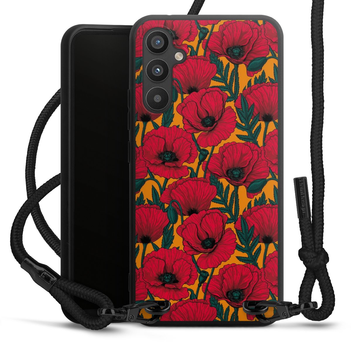 The matt black silicone case is made of flexible TPU (thermoplastic polyurethane) and offers robust protection. The durable, unbreakable material makes the cover flexible and dimensionally stable at the same time. The matte surface makes your design stand out more and is less susceptible to fingerprints and dirt. The stylish trend accessory fits comfortably in the hand and is perfectly complemented by the fabric (polyester) mobile phone strap. The braided fabric strap is approx. 1.70 metres long with a diameter of approx. 0.5 cm. Due to the special knotting technique, the length of the strap can be adjusted by simply pulling it, so that you can adapt it individually to your wishes. The practical case to wear around your neck is available with the fabric strap in black. As a little icing on the cake, we have provided the strap with a chic metal fastener in matt black. The strap is securely fastened to the case with loops made of high-quality genuine leather and press studs. The ends of the fabric strap are covered with metallic end caps and thus protected from fraying.