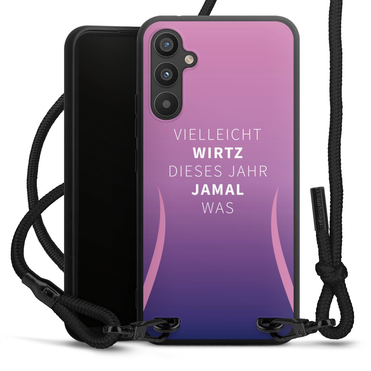 The matt black silicone case is made of flexible TPU (thermoplastic polyurethane) and offers robust protection. The durable, unbreakable material makes the cover flexible and dimensionally stable at the same time. The matte surface makes your design stand out more and is less susceptible to fingerprints and dirt. The stylish trend accessory fits comfortably in the hand and is perfectly complemented by the fabric (polyester) mobile phone strap. The braided fabric strap is approx. 1.70 metres long with a diameter of approx. 0.5 cm. Due to the special knotting technique, the length of the strap can be adjusted by simply pulling it, so that you can adapt it individually to your wishes. The practical case to wear around your neck is available with the fabric strap in black. As a little icing on the cake, we have provided the strap with a chic metal fastener in matt black. The strap is securely fastened to the case with loops made of high-quality genuine leather and press studs. The ends of the fabric strap are covered with metallic end caps and thus protected from fraying.