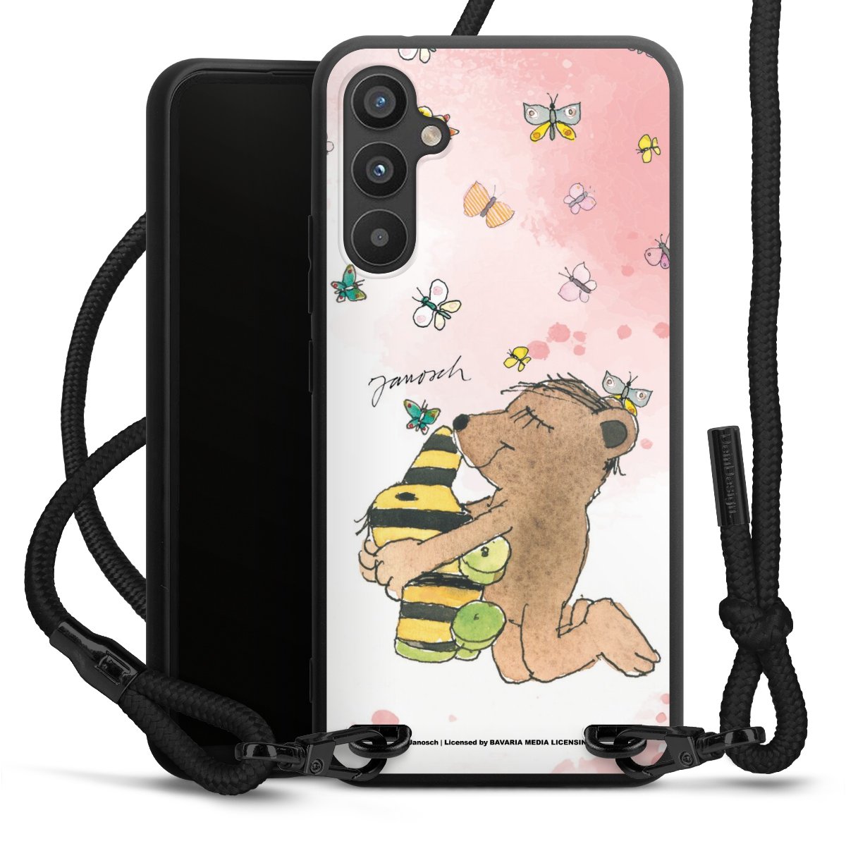 The matt black silicone case is made of flexible TPU (thermoplastic polyurethane) and offers robust protection. The durable, unbreakable material makes the cover flexible and dimensionally stable at the same time. The matte surface makes your design stand out more and is less susceptible to fingerprints and dirt. The stylish trend accessory fits comfortably in the hand and is perfectly complemented by the fabric (polyester) mobile phone strap. The braided fabric strap is approx. 1.70 metres long with a diameter of approx. 0.5 cm. Due to the special knotting technique, the length of the strap can be adjusted by simply pulling it, so that you can adapt it individually to your wishes. The practical case to wear around your neck is available with the fabric strap in black. As a little icing on the cake, we have provided the strap with a chic metal fastener in matt black. The strap is securely fastened to the case with loops made of high-quality genuine leather and press studs. The ends of the fabric strap are covered with metallic end caps and thus protected from fraying.