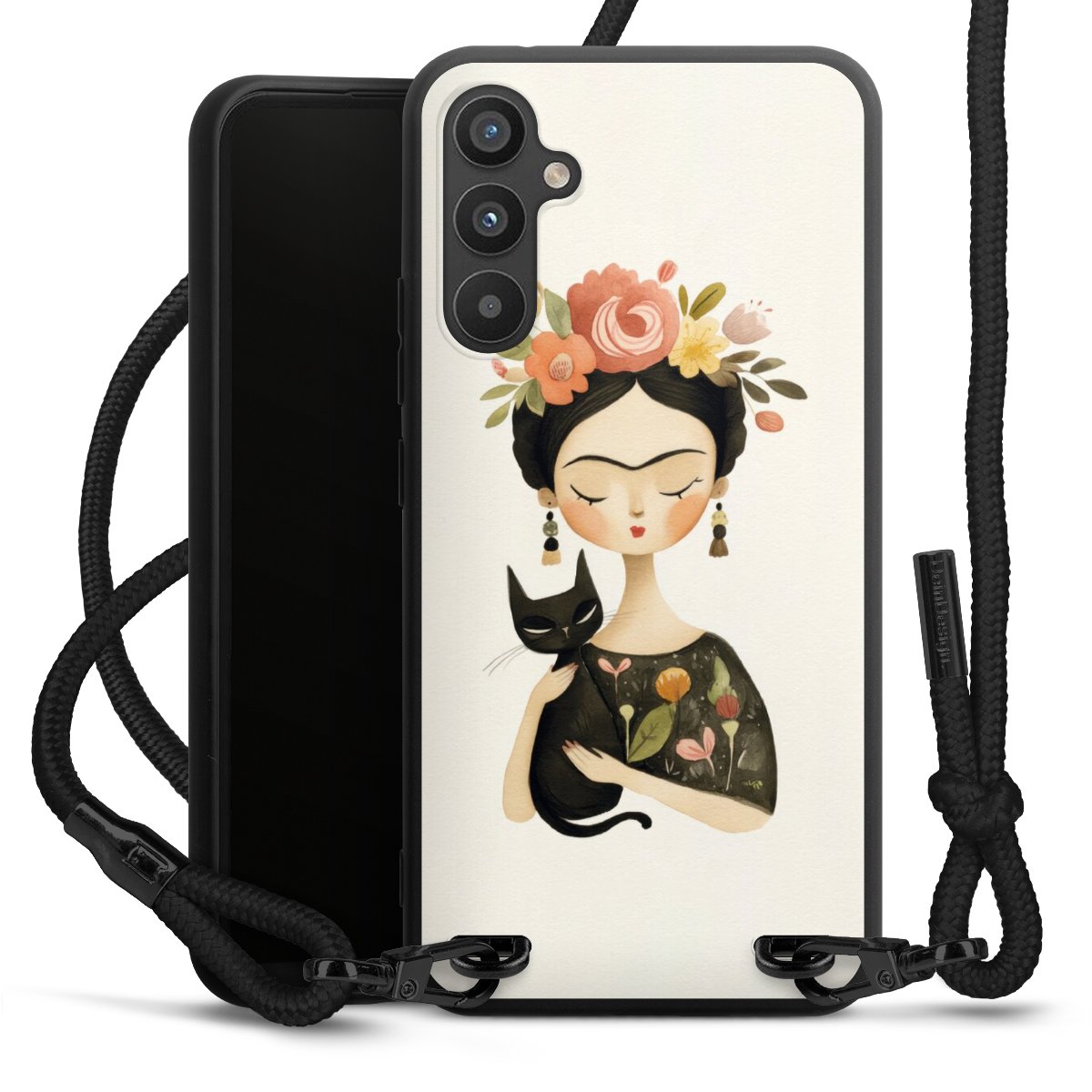 The matt black silicone case is made of flexible TPU (thermoplastic polyurethane) and offers robust protection. The durable, unbreakable material makes the cover flexible and dimensionally stable at the same time. The matte surface makes your design stand out more and is less susceptible to fingerprints and dirt. The stylish trend accessory fits comfortably in the hand and is perfectly complemented by the fabric (polyester) mobile phone strap. The braided fabric strap is approx. 1.70 metres long with a diameter of approx. 0.5 cm. Due to the special knotting technique, the length of the strap can be adjusted by simply pulling it, so that you can adapt it individually to your wishes. The practical case to wear around your neck is available with the fabric strap in black. As a little icing on the cake, we have provided the strap with a chic metal fastener in matt black. The strap is securely fastened to the case with loops made of high-quality genuine leather and press studs. The ends of the fabric strap are covered with metallic end caps and thus protected from fraying.