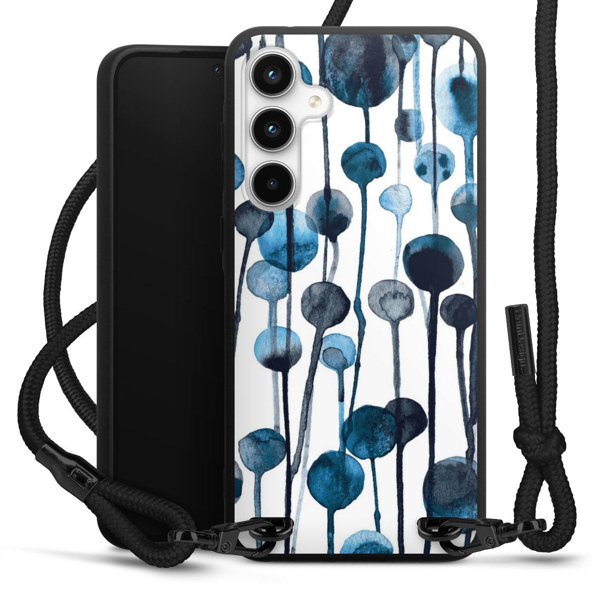The matt black silicone case is made of flexible TPU (thermoplastic polyurethane) and offers robust protection. The durable, unbreakable material makes the cover flexible and dimensionally stable at the same time. The matte surface makes your design stand out more and is less susceptible to fingerprints and dirt. The stylish trend accessory fits comfortably in the hand and is perfectly complemented by the fabric (polyester) mobile phone strap. The braided fabric strap is approx. 1.70 metres long with a diameter of approx. 0.5 cm. Due to the special knotting technique, the length of the strap can be adjusted by simply pulling it, so that you can adapt it individually to your wishes. The practical case to wear around your neck is available with the fabric strap in black. As a little icing on the cake, we have provided the strap with a chic metal fastener in matt black. The strap is securely fastened to the case with loops made of high-quality genuine leather and press studs. The ends of the fabric strap are covered with metallic end caps and thus protected from fraying.