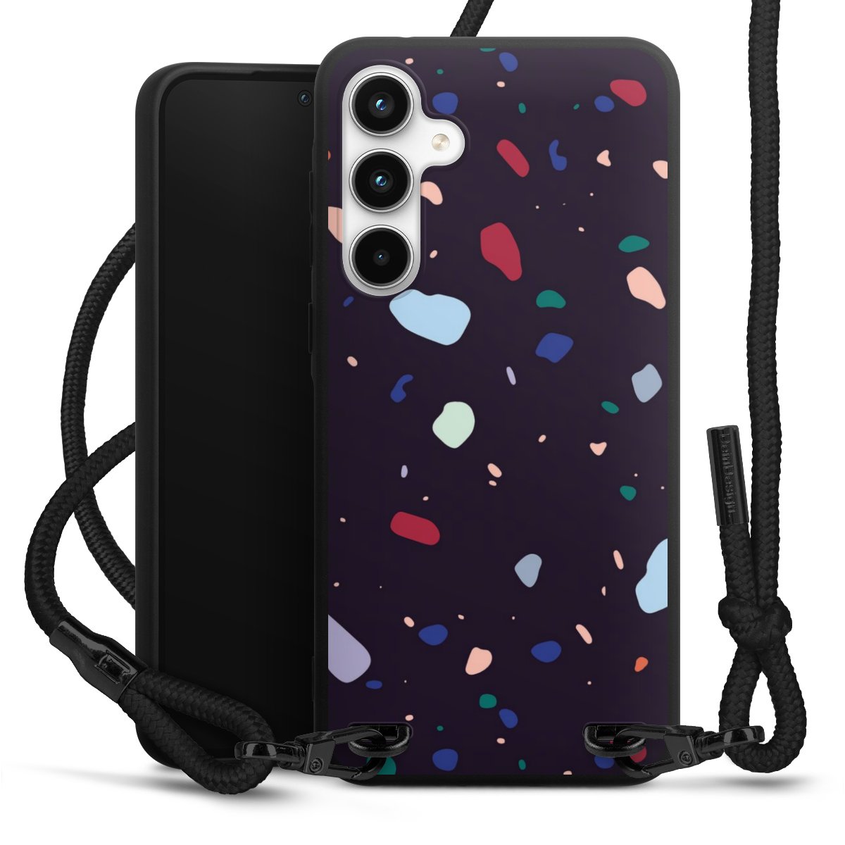 The matt black silicone case is made of flexible TPU (thermoplastic polyurethane) and offers robust protection. The durable, unbreakable material makes the cover flexible and dimensionally stable at the same time. The matte surface makes your design stand out more and is less susceptible to fingerprints and dirt. The stylish trend accessory fits comfortably in the hand and is perfectly complemented by the fabric (polyester) mobile phone strap. The braided fabric strap is approx. 1.70 metres long with a diameter of approx. 0.5 cm. Due to the special knotting technique, the length of the strap can be adjusted by simply pulling it, so that you can adapt it individually to your wishes. The practical case to wear around your neck is available with the fabric strap in black. As a little icing on the cake, we have provided the strap with a chic metal fastener in matt black. The strap is securely fastened to the case with loops made of high-quality genuine leather and press studs. The ends of the fabric strap are covered with metallic end caps and thus protected from fraying.
