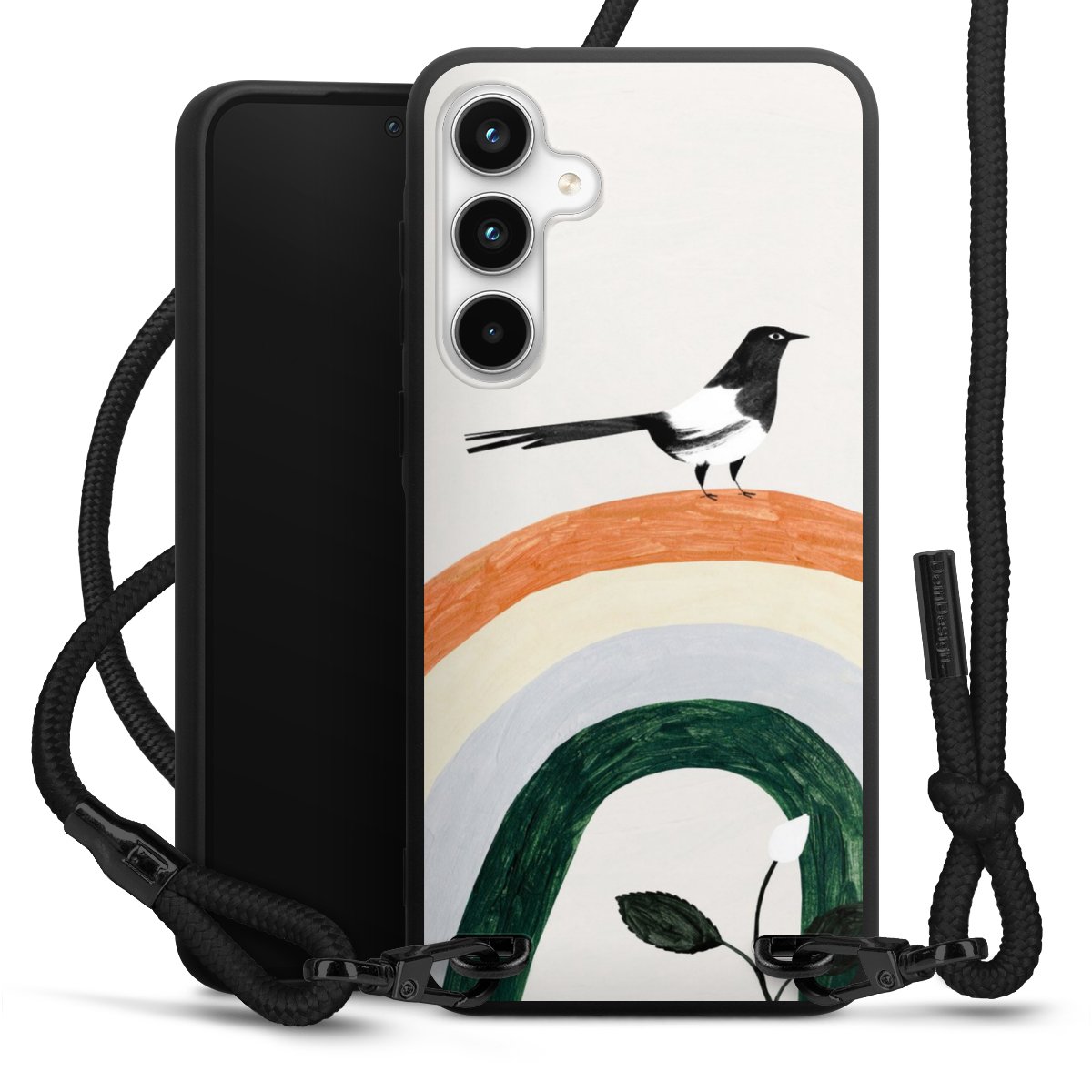 The matt black silicone case is made of flexible TPU (thermoplastic polyurethane) and offers robust protection. The durable, unbreakable material makes the cover flexible and dimensionally stable at the same time. The matte surface makes your design stand out more and is less susceptible to fingerprints and dirt. The stylish trend accessory fits comfortably in the hand and is perfectly complemented by the fabric (polyester) mobile phone strap. The braided fabric strap is approx. 1.70 metres long with a diameter of approx. 0.5 cm. Due to the special knotting technique, the length of the strap can be adjusted by simply pulling it, so that you can adapt it individually to your wishes. The practical case to wear around your neck is available with the fabric strap in black. As a little icing on the cake, we have provided the strap with a chic metal fastener in matt black. The strap is securely fastened to the case with loops made of high-quality genuine leather and press studs. The ends of the fabric strap are covered with metallic end caps and thus protected from fraying.