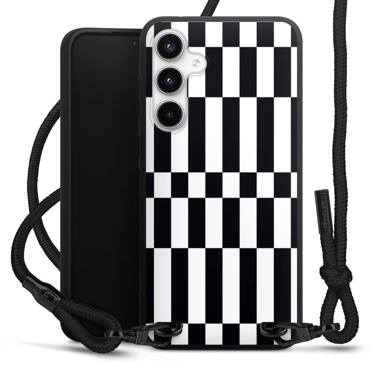The matt black silicone case is made of flexible TPU (thermoplastic polyurethane) and offers robust protection. The durable, unbreakable material makes the cover flexible and dimensionally stable at the same time. The matte surface makes your design stand out more and is less susceptible to fingerprints and dirt. The stylish trend accessory fits comfortably in the hand and is perfectly complemented by the fabric (polyester) mobile phone strap. The braided fabric strap is approx. 1.70 metres long with a diameter of approx. 0.5 cm. Due to the special knotting technique, the length of the strap can be adjusted by simply pulling it, so that you can adapt it individually to your wishes. The practical case to wear around your neck is available with the fabric strap in black. As a little icing on the cake, we have provided the strap with a chic metal fastener in matt black. The strap is securely fastened to the case with loops made of high-quality genuine leather and press studs. The ends of the fabric strap are covered with metallic end caps and thus protected from fraying.