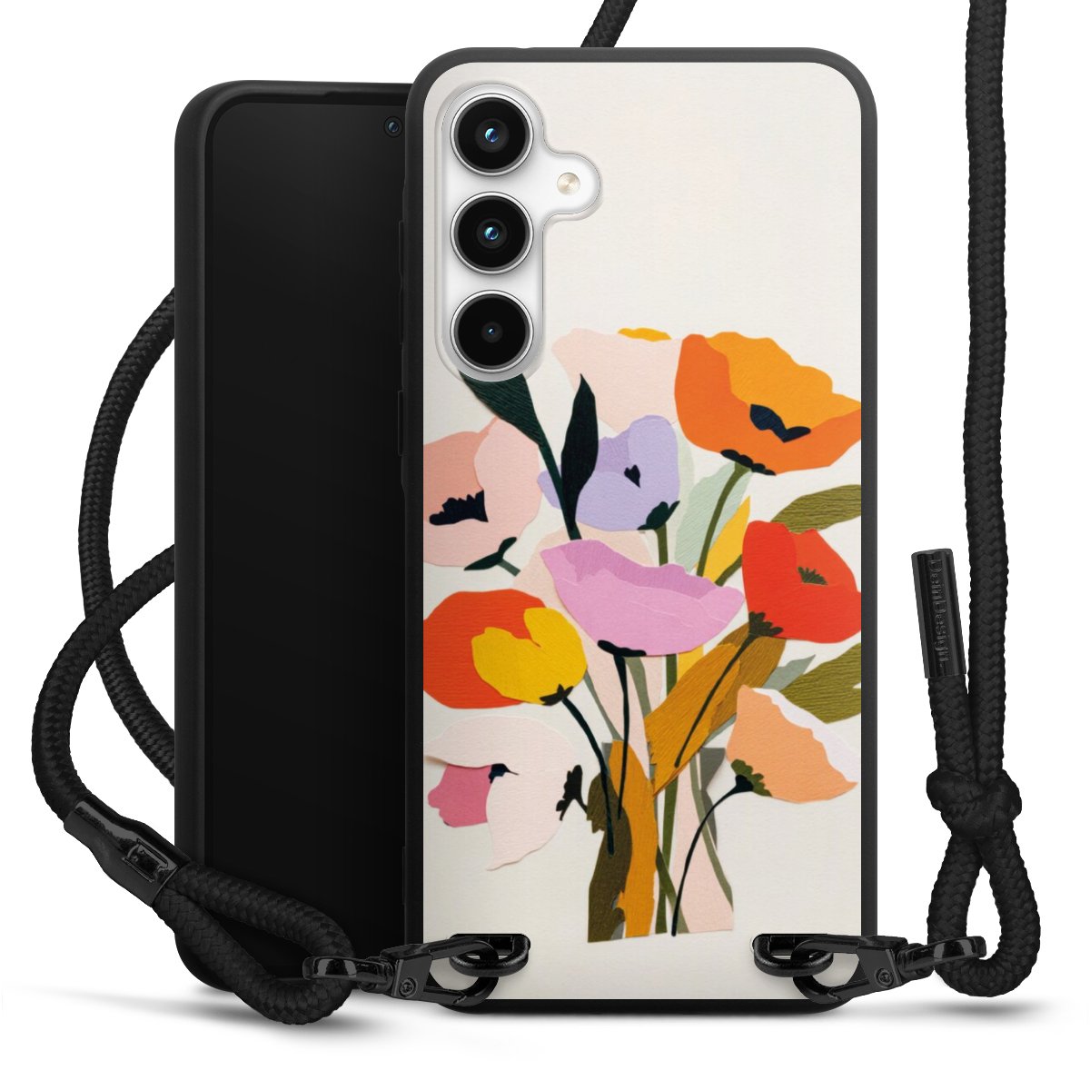 The matt black silicone case is made of flexible TPU (thermoplastic polyurethane) and offers robust protection. The durable, unbreakable material makes the cover flexible and dimensionally stable at the same time. The matte surface makes your design stand out more and is less susceptible to fingerprints and dirt. The stylish trend accessory fits comfortably in the hand and is perfectly complemented by the fabric (polyester) mobile phone strap. The braided fabric strap is approx. 1.70 metres long with a diameter of approx. 0.5 cm. Due to the special knotting technique, the length of the strap can be adjusted by simply pulling it, so that you can adapt it individually to your wishes. The practical case to wear around your neck is available with the fabric strap in black. As a little icing on the cake, we have provided the strap with a chic metal fastener in matt black. The strap is securely fastened to the case with loops made of high-quality genuine leather and press studs. The ends of the fabric strap are covered with metallic end caps and thus protected from fraying.