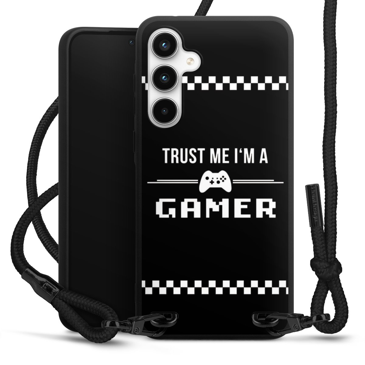 The matt black silicone case is made of flexible TPU (thermoplastic polyurethane) and offers robust protection. The durable, unbreakable material makes the cover flexible and dimensionally stable at the same time. The matte surface makes your design stand out more and is less susceptible to fingerprints and dirt. The stylish trend accessory fits comfortably in the hand and is perfectly complemented by the fabric (polyester) mobile phone strap. The braided fabric strap is approx. 1.70 metres long with a diameter of approx. 0.5 cm. Due to the special knotting technique, the length of the strap can be adjusted by simply pulling it, so that you can adapt it individually to your wishes. The practical case to wear around your neck is available with the fabric strap in black. As a little icing on the cake, we have provided the strap with a chic metal fastener in matt black. The strap is securely fastened to the case with loops made of high-quality genuine leather and press studs. The ends of the fabric strap are covered with metallic end caps and thus protected from fraying.