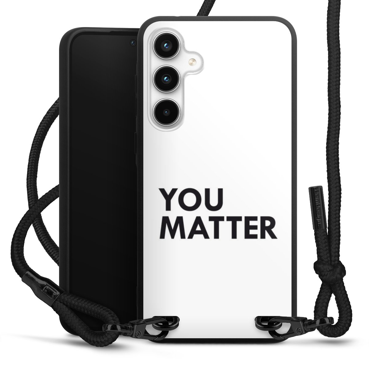 The matt black silicone case is made of flexible TPU (thermoplastic polyurethane) and offers robust protection. The durable, unbreakable material makes the cover flexible and dimensionally stable at the same time. The matte surface makes your design stand out more and is less susceptible to fingerprints and dirt. The stylish trend accessory fits comfortably in the hand and is perfectly complemented by the fabric (polyester) mobile phone strap. The braided fabric strap is approx. 1.70 metres long with a diameter of approx. 0.5 cm. Due to the special knotting technique, the length of the strap can be adjusted by simply pulling it, so that you can adapt it individually to your wishes. The practical case to wear around your neck is available with the fabric strap in black. As a little icing on the cake, we have provided the strap with a chic metal fastener in matt black. The strap is securely fastened to the case with loops made of high-quality genuine leather and press studs. The ends of the fabric strap are covered with metallic end caps and thus protected from fraying.