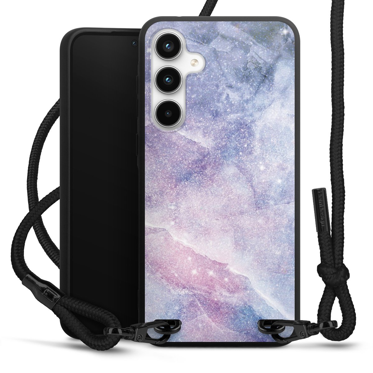 The matt black silicone case is made of flexible TPU (thermoplastic polyurethane) and offers robust protection. The durable, unbreakable material makes the cover flexible and dimensionally stable at the same time. The matte surface makes your design stand out more and is less susceptible to fingerprints and dirt. The stylish trend accessory fits comfortably in the hand and is perfectly complemented by the fabric (polyester) mobile phone strap. The braided fabric strap is approx. 1.70 metres long with a diameter of approx. 0.5 cm. Due to the special knotting technique, the length of the strap can be adjusted by simply pulling it, so that you can adapt it individually to your wishes. The practical case to wear around your neck is available with the fabric strap in black. As a little icing on the cake, we have provided the strap with a chic metal fastener in matt black. The strap is securely fastened to the case with loops made of high-quality genuine leather and press studs. The ends of the fabric strap are covered with metallic end caps and thus protected from fraying.