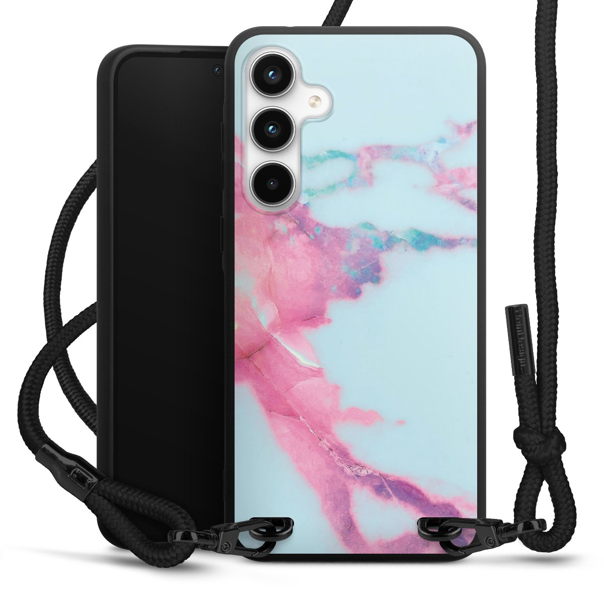 The matt black silicone case is made of flexible TPU (thermoplastic polyurethane) and offers robust protection. The durable, unbreakable material makes the cover flexible and dimensionally stable at the same time. The matte surface makes your design stand out more and is less susceptible to fingerprints and dirt. The stylish trend accessory fits comfortably in the hand and is perfectly complemented by the fabric (polyester) mobile phone strap. The braided fabric strap is approx. 1.70 metres long with a diameter of approx. 0.5 cm. Due to the special knotting technique, the length of the strap can be adjusted by simply pulling it, so that you can adapt it individually to your wishes. The practical case to wear around your neck is available with the fabric strap in black. As a little icing on the cake, we have provided the strap with a chic metal fastener in matt black. The strap is securely fastened to the case with loops made of high-quality genuine leather and press studs. The ends of the fabric strap are covered with metallic end caps and thus protected from fraying.