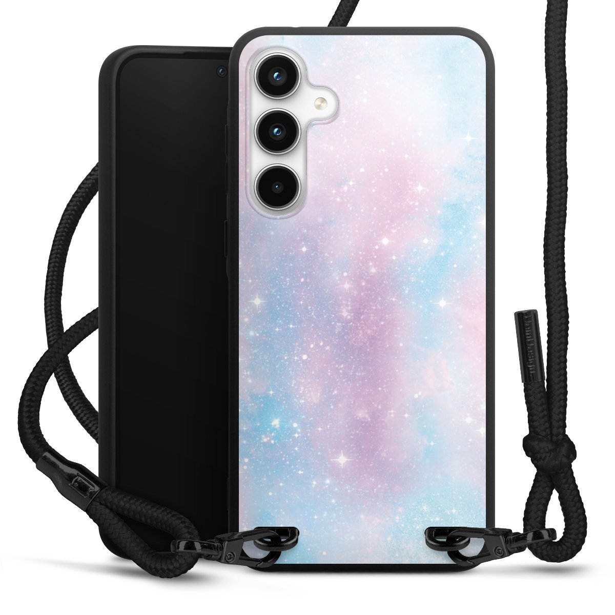 The matt black silicone case is made of flexible TPU (thermoplastic polyurethane) and offers robust protection. The durable, unbreakable material makes the cover flexible and dimensionally stable at the same time. The matte surface makes your design stand out more and is less susceptible to fingerprints and dirt. The stylish trend accessory fits comfortably in the hand and is perfectly complemented by the fabric (polyester) mobile phone strap. The braided fabric strap is approx. 1.70 metres long with a diameter of approx. 0.5 cm. Due to the special knotting technique, the length of the strap can be adjusted by simply pulling it, so that you can adapt it individually to your wishes. The practical case to wear around your neck is available with the fabric strap in black. As a little icing on the cake, we have provided the strap with a chic metal fastener in matt black. The strap is securely fastened to the case with loops made of high-quality genuine leather and press studs. The ends of the fabric strap are covered with metallic end caps and thus protected from fraying.