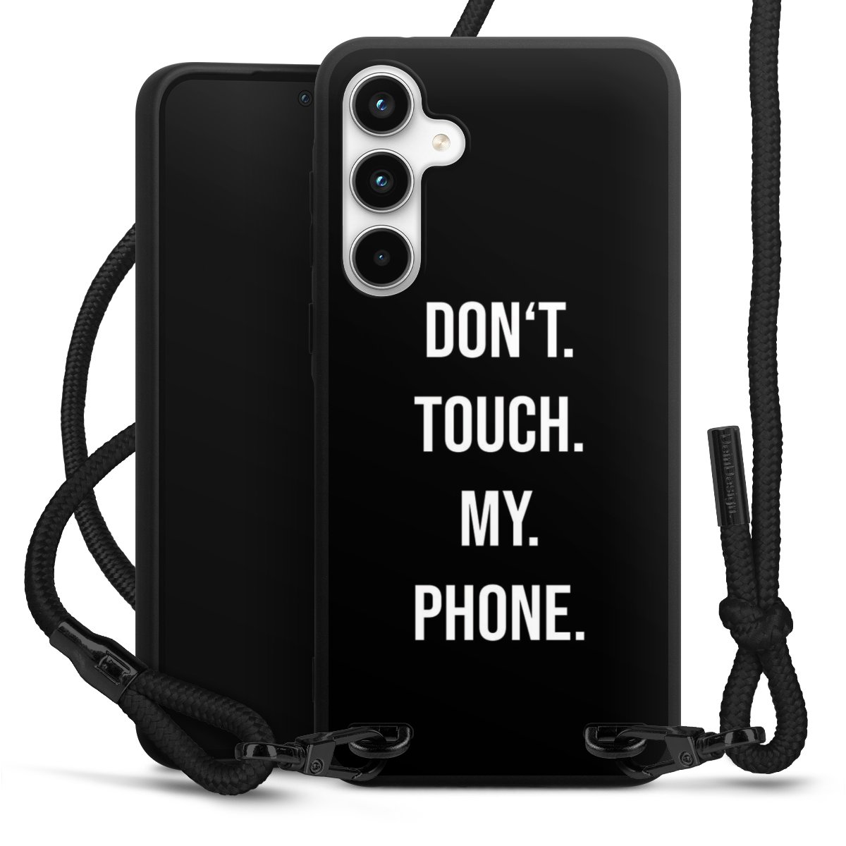 The matt black silicone case is made of flexible TPU (thermoplastic polyurethane) and offers robust protection. The durable, unbreakable material makes the cover flexible and dimensionally stable at the same time. The matte surface makes your design stand out more and is less susceptible to fingerprints and dirt. The stylish trend accessory fits comfortably in the hand and is perfectly complemented by the fabric (polyester) mobile phone strap. The braided fabric strap is approx. 1.70 metres long with a diameter of approx. 0.5 cm. Due to the special knotting technique, the length of the strap can be adjusted by simply pulling it, so that you can adapt it individually to your wishes. The practical case to wear around your neck is available with the fabric strap in black. As a little icing on the cake, we have provided the strap with a chic metal fastener in matt black. The strap is securely fastened to the case with loops made of high-quality genuine leather and press studs. The ends of the fabric strap are covered with metallic end caps and thus protected from fraying.