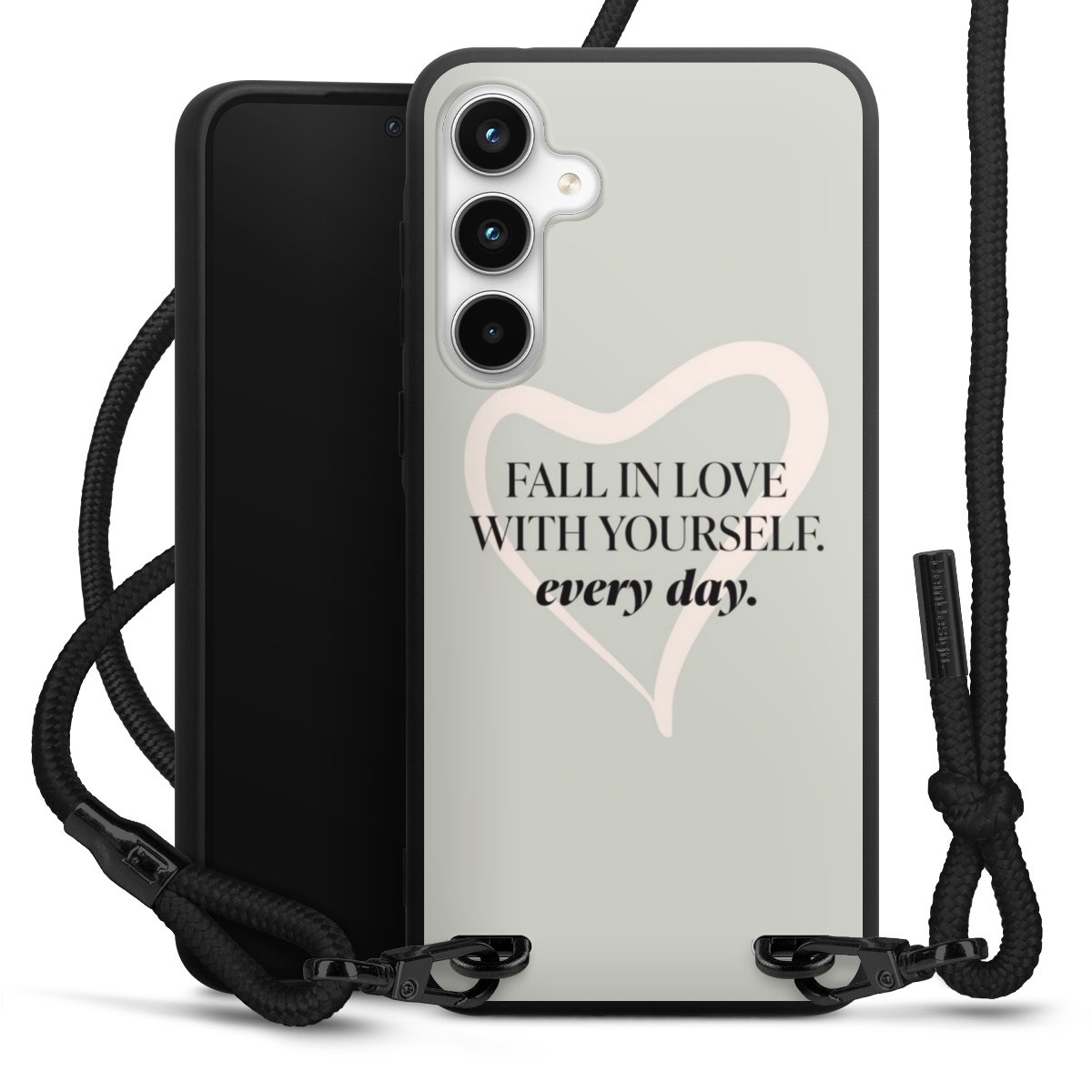 The matt black silicone case is made of flexible TPU (thermoplastic polyurethane) and offers robust protection. The durable, unbreakable material makes the cover flexible and dimensionally stable at the same time. The matte surface makes your design stand out more and is less susceptible to fingerprints and dirt. The stylish trend accessory fits comfortably in the hand and is perfectly complemented by the fabric (polyester) mobile phone strap. The braided fabric strap is approx. 1.70 metres long with a diameter of approx. 0.5 cm. Due to the special knotting technique, the length of the strap can be adjusted by simply pulling it, so that you can adapt it individually to your wishes. The practical case to wear around your neck is available with the fabric strap in black. As a little icing on the cake, we have provided the strap with a chic metal fastener in matt black. The strap is securely fastened to the case with loops made of high-quality genuine leather and press studs. The ends of the fabric strap are covered with metallic end caps and thus protected from fraying.