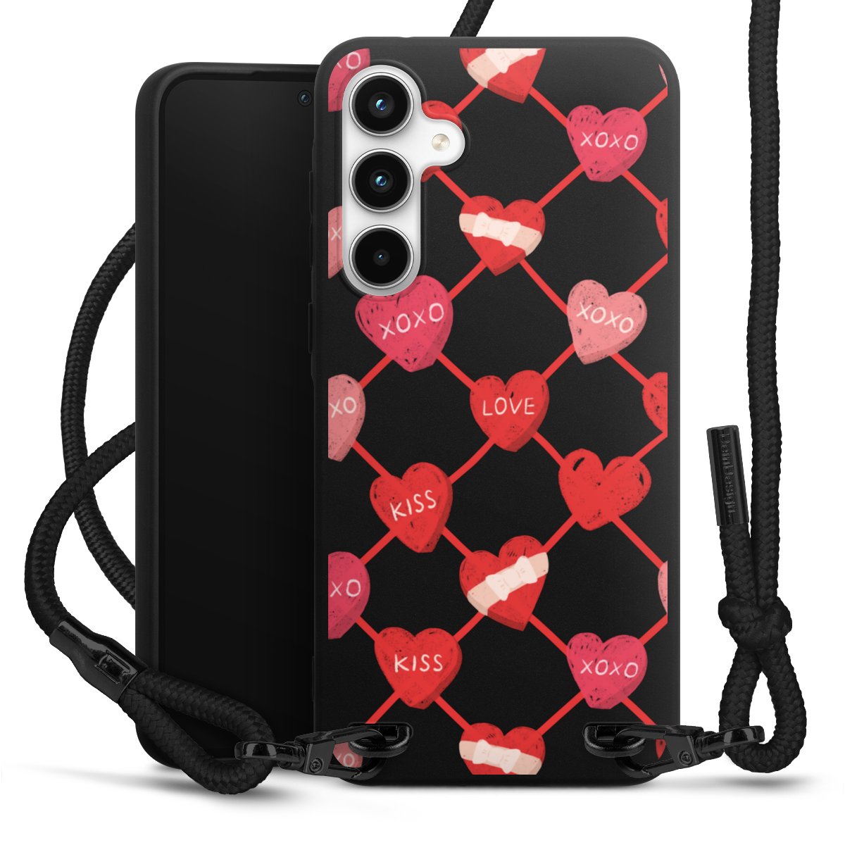 The matt black silicone case is made of flexible TPU (thermoplastic polyurethane) and offers robust protection. The durable, unbreakable material makes the cover flexible and dimensionally stable at the same time. The matte surface makes your design stand out more and is less susceptible to fingerprints and dirt. The stylish trend accessory fits comfortably in the hand and is perfectly complemented by the fabric (polyester) mobile phone strap. The braided fabric strap is approx. 1.70 metres long with a diameter of approx. 0.5 cm. Due to the special knotting technique, the length of the strap can be adjusted by simply pulling it, so that you can adapt it individually to your wishes. The practical case to wear around your neck is available with the fabric strap in black. As a little icing on the cake, we have provided the strap with a chic metal fastener in matt black. The strap is securely fastened to the case with loops made of high-quality genuine leather and press studs. The ends of the fabric strap are covered with metallic end caps and thus protected from fraying.