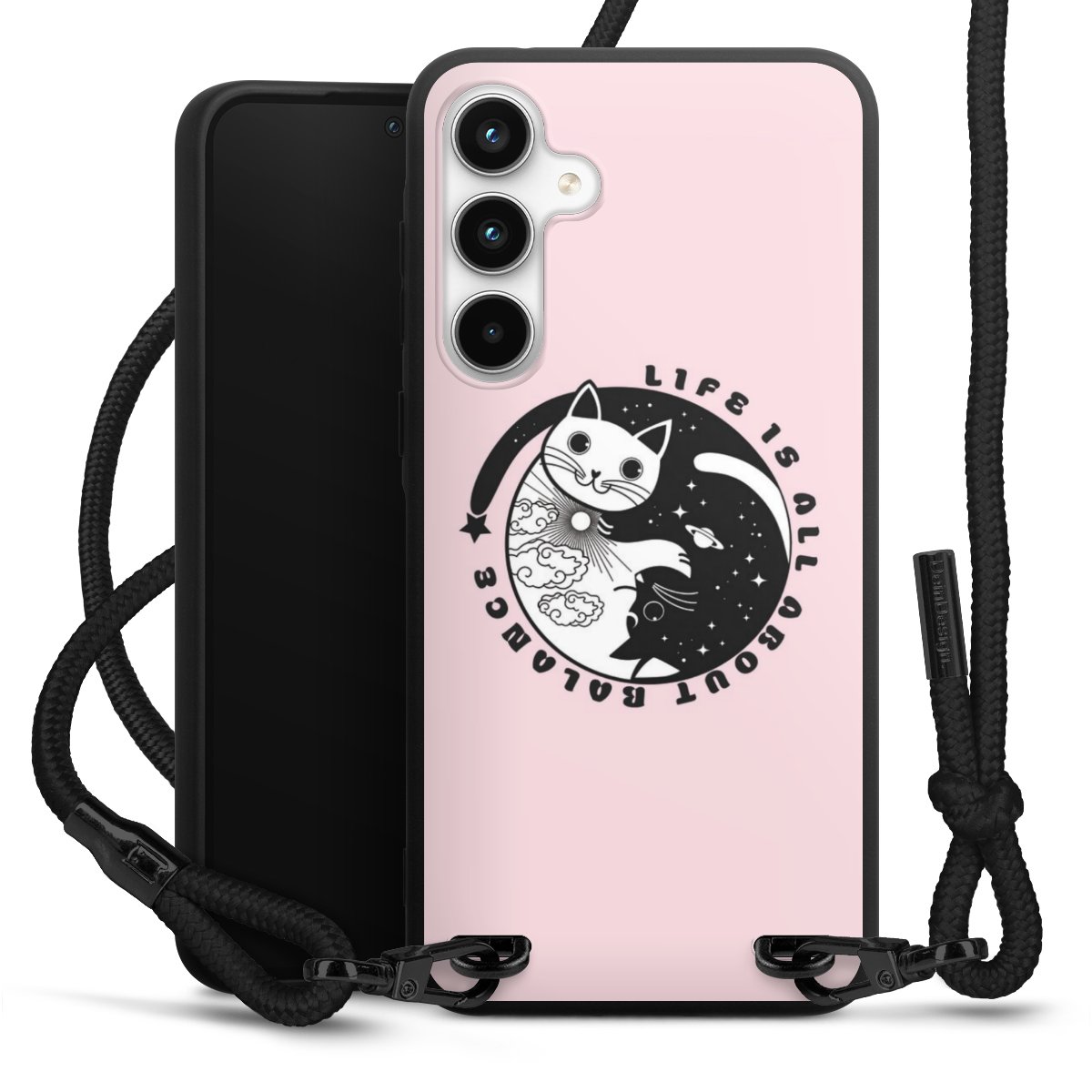 The matt black silicone case is made of flexible TPU (thermoplastic polyurethane) and offers robust protection. The durable, unbreakable material makes the cover flexible and dimensionally stable at the same time. The matte surface makes your design stand out more and is less susceptible to fingerprints and dirt. The stylish trend accessory fits comfortably in the hand and is perfectly complemented by the fabric (polyester) mobile phone strap. The braided fabric strap is approx. 1.70 metres long with a diameter of approx. 0.5 cm. Due to the special knotting technique, the length of the strap can be adjusted by simply pulling it, so that you can adapt it individually to your wishes. The practical case to wear around your neck is available with the fabric strap in black. As a little icing on the cake, we have provided the strap with a chic metal fastener in matt black. The strap is securely fastened to the case with loops made of high-quality genuine leather and press studs. The ends of the fabric strap are covered with metallic end caps and thus protected from fraying.