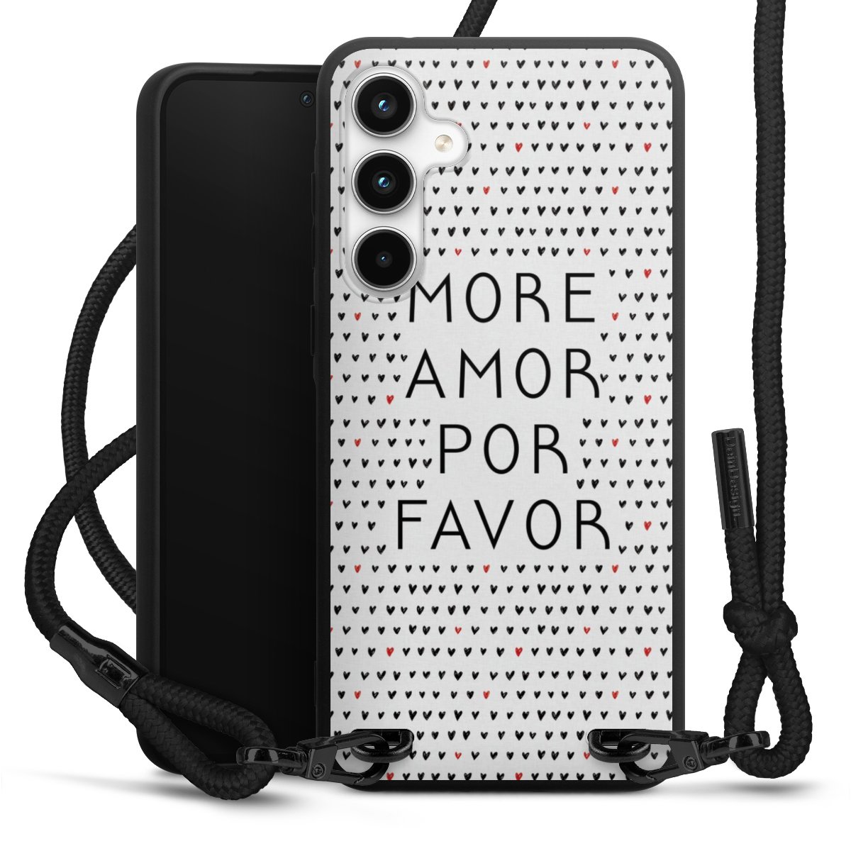 The matt black silicone case is made of flexible TPU (thermoplastic polyurethane) and offers robust protection. The durable, unbreakable material makes the cover flexible and dimensionally stable at the same time. The matte surface makes your design stand out more and is less susceptible to fingerprints and dirt. The stylish trend accessory fits comfortably in the hand and is perfectly complemented by the fabric (polyester) mobile phone strap. The braided fabric strap is approx. 1.70 metres long with a diameter of approx. 0.5 cm. Due to the special knotting technique, the length of the strap can be adjusted by simply pulling it, so that you can adapt it individually to your wishes. The practical case to wear around your neck is available with the fabric strap in black. As a little icing on the cake, we have provided the strap with a chic metal fastener in matt black. The strap is securely fastened to the case with loops made of high-quality genuine leather and press studs. The ends of the fabric strap are covered with metallic end caps and thus protected from fraying.