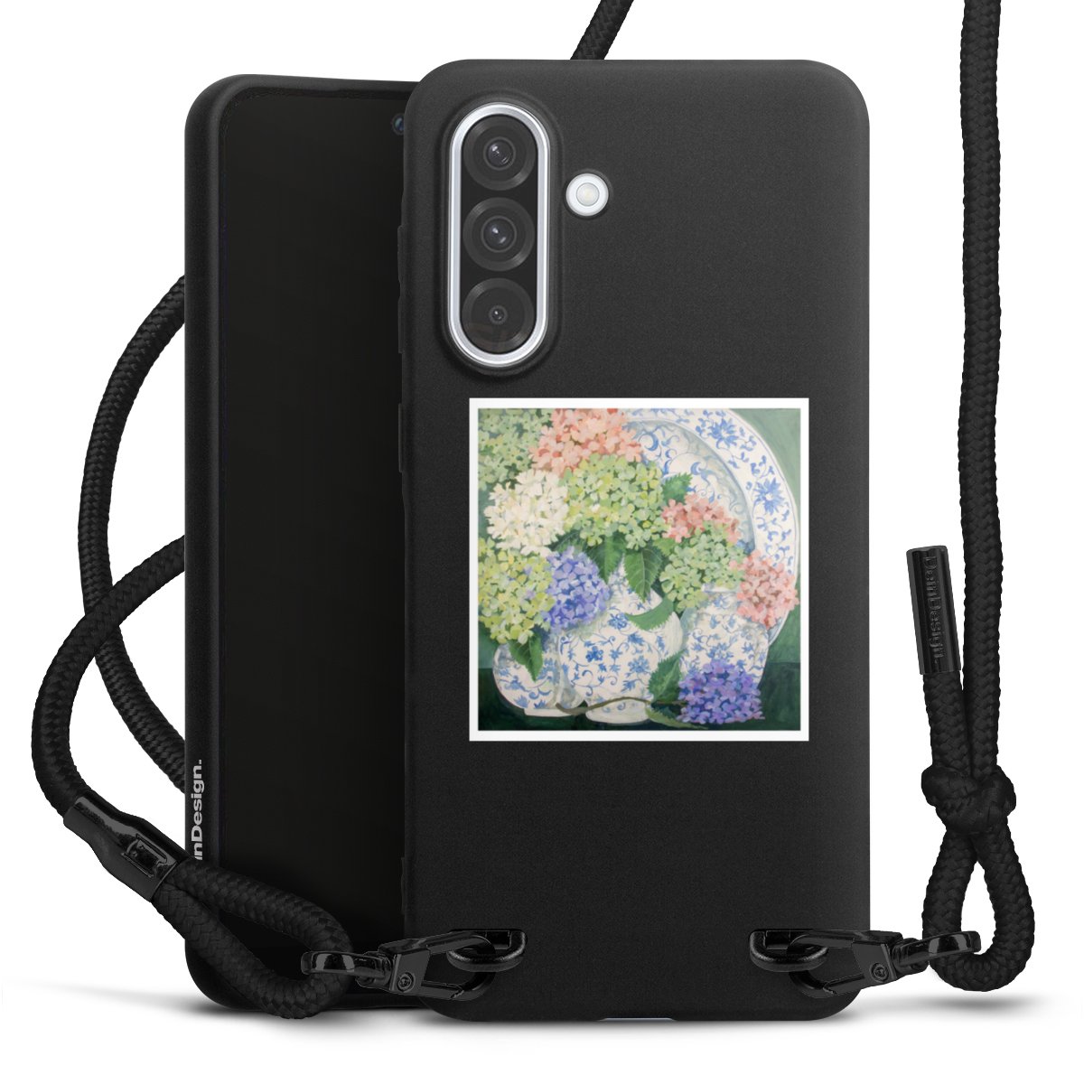 The matt black silicone case is made of flexible TPU (thermoplastic polyurethane) and offers robust protection. The durable, unbreakable material makes the cover flexible and dimensionally stable at the same time. The matte surface makes your design stand out more and is less susceptible to fingerprints and dirt. The stylish trend accessory fits comfortably in the hand and is perfectly complemented by the fabric (polyester) mobile phone strap. The braided fabric strap is approx. 1.70 metres long with a diameter of approx. 0.5 cm. Due to the special knotting technique, the length of the strap can be adjusted by simply pulling it, so that you can adapt it individually to your wishes. The practical case to wear around your neck is available with the fabric strap in black. As a little icing on the cake, we have provided the strap with a chic metal fastener in matt black. The strap is securely fastened to the case with loops made of high-quality genuine leather and press studs. The ends of the fabric strap are covered with metallic end caps and thus protected from fraying.