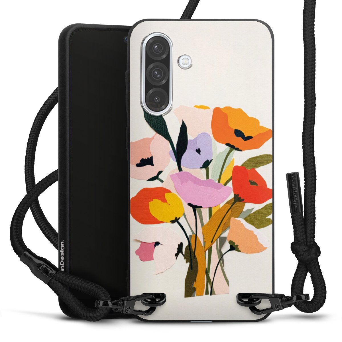 The matt black silicone case is made of flexible TPU (thermoplastic polyurethane) and offers robust protection. The durable, unbreakable material makes the cover flexible and dimensionally stable at the same time. The matte surface makes your design stand out more and is less susceptible to fingerprints and dirt. The stylish trend accessory fits comfortably in the hand and is perfectly complemented by the fabric (polyester) mobile phone strap. The braided fabric strap is approx. 1.70 metres long with a diameter of approx. 0.5 cm. Due to the special knotting technique, the length of the strap can be adjusted by simply pulling it, so that you can adapt it individually to your wishes. The practical case to wear around your neck is available with the fabric strap in black. As a little icing on the cake, we have provided the strap with a chic metal fastener in matt black. The strap is securely fastened to the case with loops made of high-quality genuine leather and press studs. The ends of the fabric strap are covered with metallic end caps and thus protected from fraying.