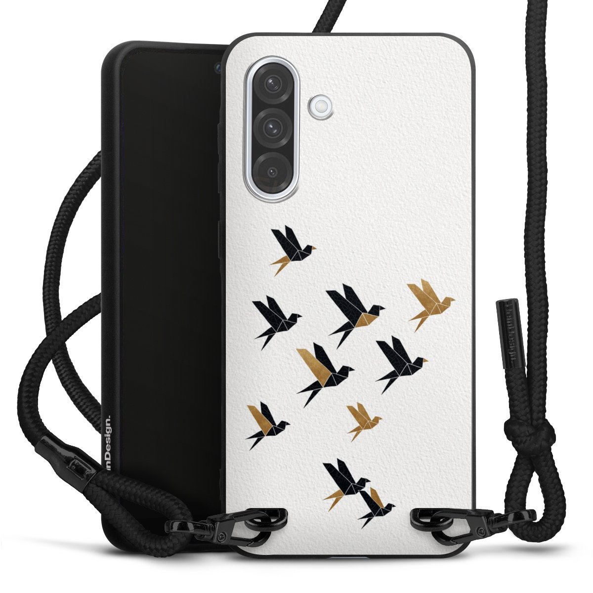 The matt black silicone case is made of flexible TPU (thermoplastic polyurethane) and offers robust protection. The durable, unbreakable material makes the cover flexible and dimensionally stable at the same time. The matte surface makes your design stand out more and is less susceptible to fingerprints and dirt. The stylish trend accessory fits comfortably in the hand and is perfectly complemented by the fabric (polyester) mobile phone strap. The braided fabric strap is approx. 1.70 metres long with a diameter of approx. 0.5 cm. Due to the special knotting technique, the length of the strap can be adjusted by simply pulling it, so that you can adapt it individually to your wishes. The practical case to wear around your neck is available with the fabric strap in black. As a little icing on the cake, we have provided the strap with a chic metal fastener in matt black. The strap is securely fastened to the case with loops made of high-quality genuine leather and press studs. The ends of the fabric strap are covered with metallic end caps and thus protected from fraying.