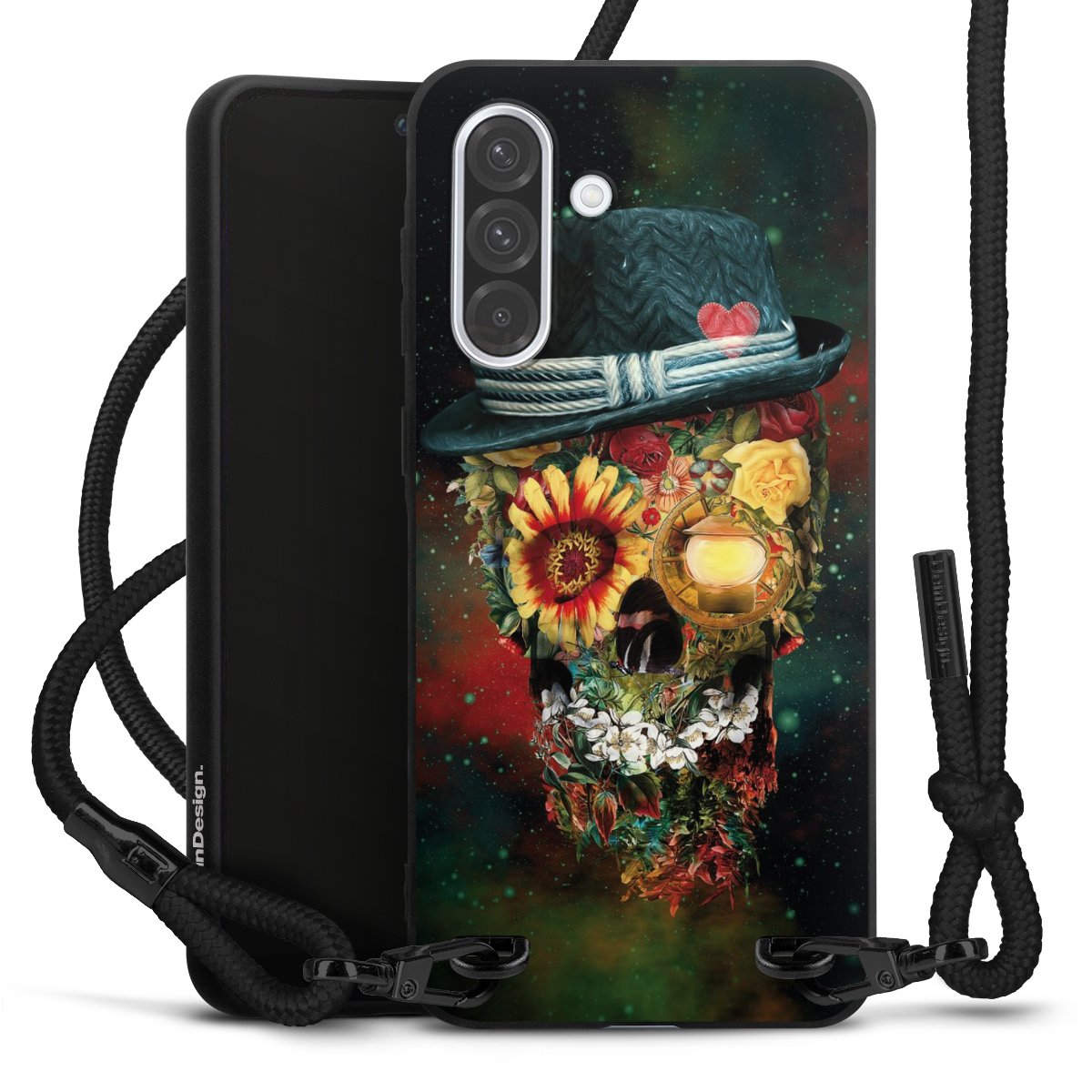 The matt black silicone case is made of flexible TPU (thermoplastic polyurethane) and offers robust protection. The durable, unbreakable material makes the cover flexible and dimensionally stable at the same time. The matte surface makes your design stand out more and is less susceptible to fingerprints and dirt. The stylish trend accessory fits comfortably in the hand and is perfectly complemented by the fabric (polyester) mobile phone strap. The braided fabric strap is approx. 1.70 metres long with a diameter of approx. 0.5 cm. Due to the special knotting technique, the length of the strap can be adjusted by simply pulling it, so that you can adapt it individually to your wishes. The practical case to wear around your neck is available with the fabric strap in black. As a little icing on the cake, we have provided the strap with a chic metal fastener in matt black. The strap is securely fastened to the case with loops made of high-quality genuine leather and press studs. The ends of the fabric strap are covered with metallic end caps and thus protected from fraying.