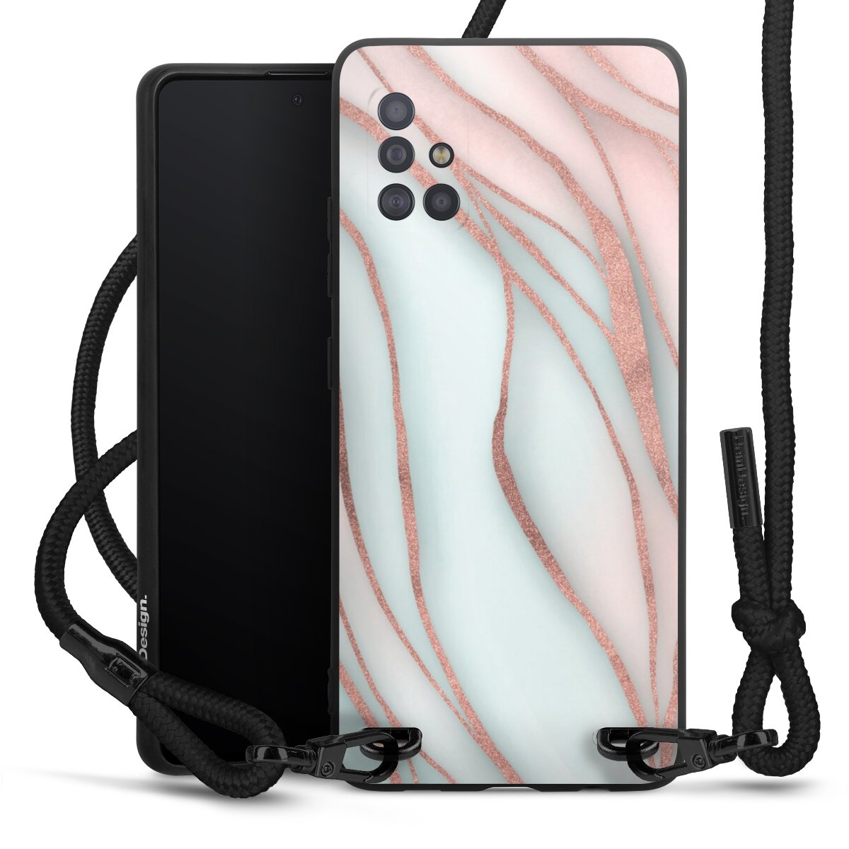 The matt black silicone case is made of flexible TPU (thermoplastic polyurethane) and offers robust protection. The durable, unbreakable material makes the cover flexible and dimensionally stable at the same time. The matte surface makes your design stand out more and is less susceptible to fingerprints and dirt. The stylish trend accessory fits comfortably in the hand and is perfectly complemented by the fabric (polyester) mobile phone strap. The braided fabric strap is approx. 1.70 metres long with a diameter of approx. 0.5 cm. Due to the special knotting technique, the length of the strap can be adjusted by simply pulling it, so that you can adapt it individually to your wishes. The practical case to wear around your neck is available with the fabric strap in black. As a little icing on the cake, we have provided the strap with a chic metal fastener in matt black. The strap is securely fastened to the case with loops made of high-quality genuine leather and press studs. The ends of the fabric strap are covered with metallic end caps and thus protected from fraying.