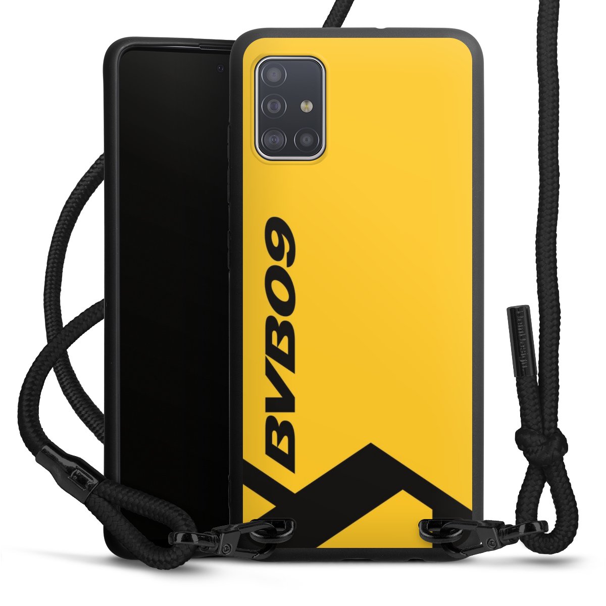 The matt black silicone case is made of flexible TPU (thermoplastic polyurethane) and offers robust protection. The durable, unbreakable material makes the cover flexible and dimensionally stable at the same time. The matte surface makes your design stand out more and is less susceptible to fingerprints and dirt. The stylish trend accessory fits comfortably in the hand and is perfectly complemented by the fabric (polyester) mobile phone strap. The braided fabric strap is approx. 1.70 metres long with a diameter of approx. 0.5 cm. Due to the special knotting technique, the length of the strap can be adjusted by simply pulling it, so that you can adapt it individually to your wishes. The practical case to wear around your neck is available with the fabric strap in black. As a little icing on the cake, we have provided the strap with a chic metal fastener in matt black. The strap is securely fastened to the case with loops made of high-quality genuine leather and press studs. The ends of the fabric strap are covered with metallic end caps and thus protected from fraying.