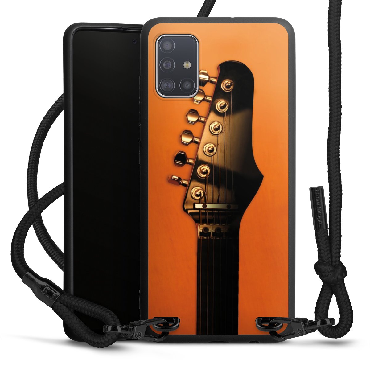 The matt black silicone case is made of flexible TPU (thermoplastic polyurethane) and offers robust protection. The durable, unbreakable material makes the cover flexible and dimensionally stable at the same time. The matte surface makes your design stand out more and is less susceptible to fingerprints and dirt. The stylish trend accessory fits comfortably in the hand and is perfectly complemented by the fabric (polyester) mobile phone strap. The braided fabric strap is approx. 1.70 metres long with a diameter of approx. 0.5 cm. Due to the special knotting technique, the length of the strap can be adjusted by simply pulling it, so that you can adapt it individually to your wishes. The practical case to wear around your neck is available with the fabric strap in black. As a little icing on the cake, we have provided the strap with a chic metal fastener in matt black. The strap is securely fastened to the case with loops made of high-quality genuine leather and press studs. The ends of the fabric strap are covered with metallic end caps and thus protected from fraying.