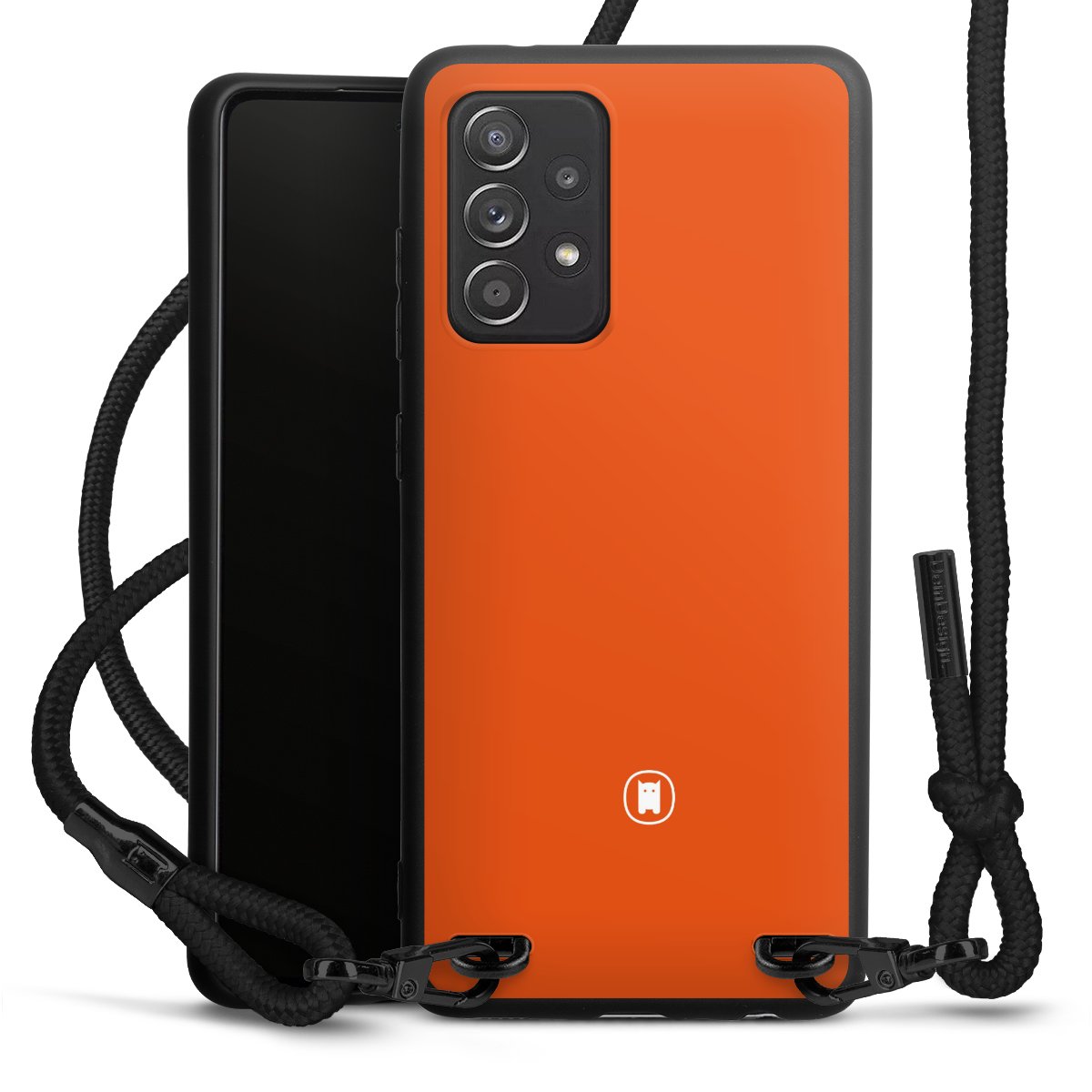The matt black silicone case is made of flexible TPU (thermoplastic polyurethane) and offers robust protection. The durable, unbreakable material makes the cover flexible and dimensionally stable at the same time. The matte surface makes your design stand out more and is less susceptible to fingerprints and dirt. The stylish trend accessory fits comfortably in the hand and is perfectly complemented by the fabric (polyester) mobile phone strap. The braided fabric strap is approx. 1.70 metres long with a diameter of approx. 0.5 cm. Due to the special knotting technique, the length of the strap can be adjusted by simply pulling it, so that you can adapt it individually to your wishes. The practical case to wear around your neck is available with the fabric strap in black. As a little icing on the cake, we have provided the strap with a chic metal fastener in matt black. The strap is securely fastened to the case with loops made of high-quality genuine leather and press studs. The ends of the fabric strap are covered with metallic end caps and thus protected from fraying.