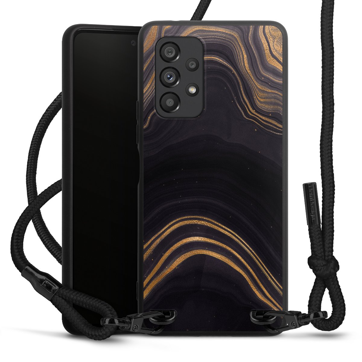 The matt black silicone case is made of flexible TPU (thermoplastic polyurethane) and offers robust protection. The durable, unbreakable material makes the cover flexible and dimensionally stable at the same time. The matte surface makes your design stand out more and is less susceptible to fingerprints and dirt. The stylish trend accessory fits comfortably in the hand and is perfectly complemented by the fabric (polyester) mobile phone strap. The braided fabric strap is approx. 1.70 metres long with a diameter of approx. 0.5 cm. Due to the special knotting technique, the length of the strap can be adjusted by simply pulling it, so that you can adapt it individually to your wishes. The practical case to wear around your neck is available with the fabric strap in black. As a little icing on the cake, we have provided the strap with a chic metal fastener in matt black. The strap is securely fastened to the case with loops made of high-quality genuine leather and press studs. The ends of the fabric strap are covered with metallic end caps and thus protected from fraying.