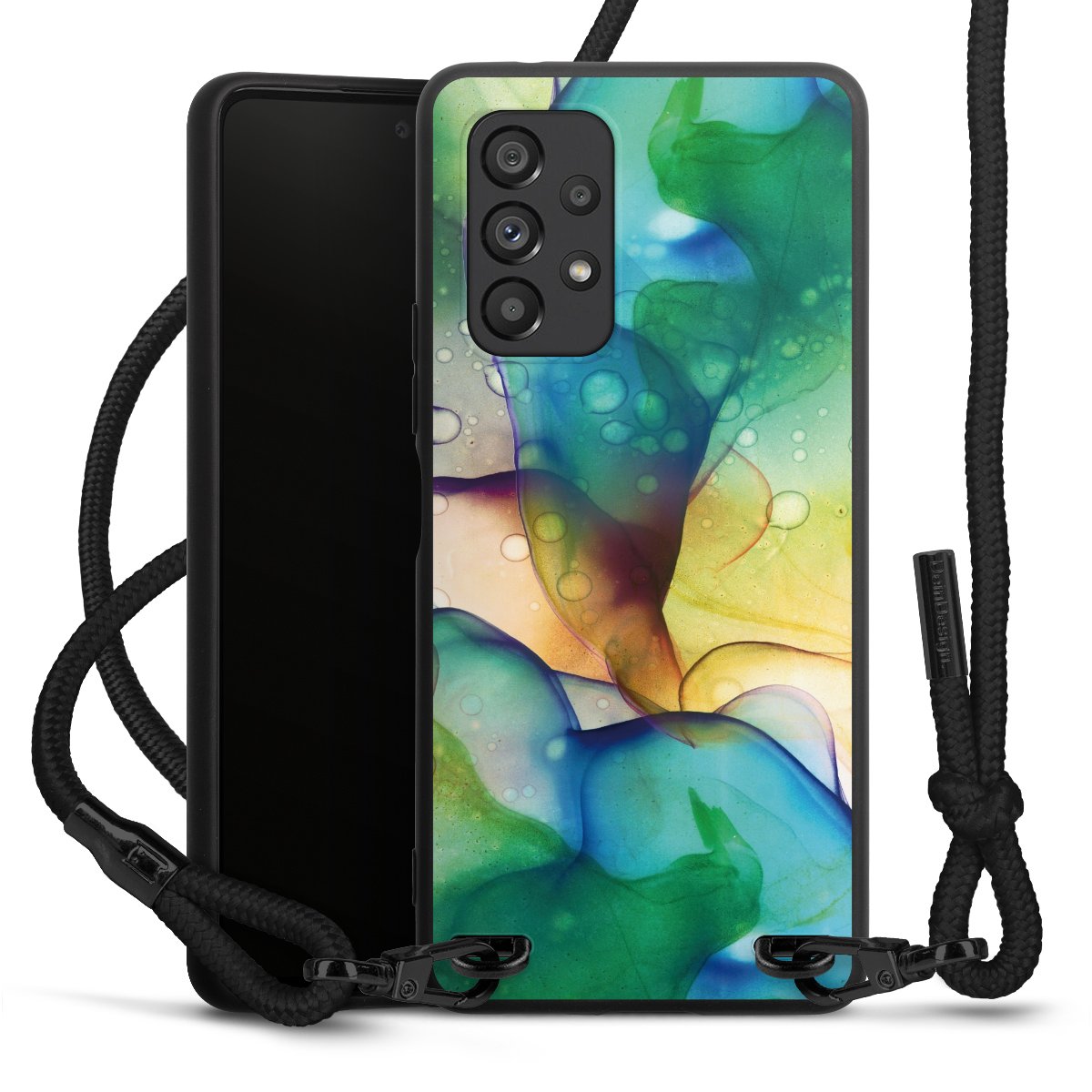 We use the solid direct print process for this phone case, which is why the print area only covers the back and the edge remains unprinted. The case to wear around your neck can be ordered unprinted, fully printed, or partially printed. For your design, either choose one of our exclusive shop motifs or get creative and create your own design, for example with photos and overlays. Design your own personal trend accessory and make an individual statement on the streets!
