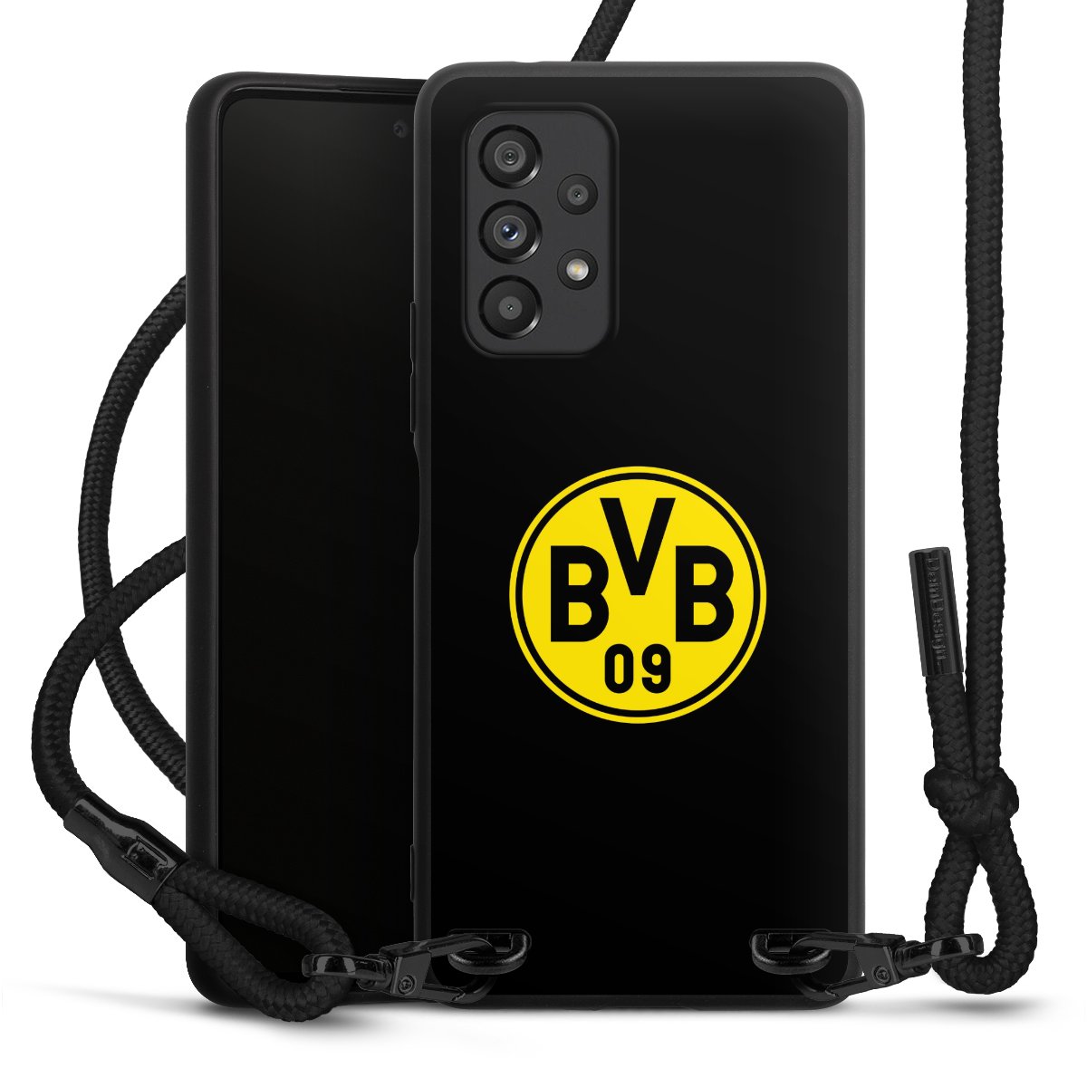 The matt black silicone case is made of flexible TPU (thermoplastic polyurethane) and offers robust protection. The durable, unbreakable material makes the cover flexible and dimensionally stable at the same time. The matte surface makes your design stand out more and is less susceptible to fingerprints and dirt. The stylish trend accessory fits comfortably in the hand and is perfectly complemented by the fabric (polyester) mobile phone strap. The braided fabric strap is approx. 1.70 metres long with a diameter of approx. 0.5 cm. Due to the special knotting technique, the length of the strap can be adjusted by simply pulling it, so that you can adapt it individually to your wishes. The practical case to wear around your neck is available with the fabric strap in black. As a little icing on the cake, we have provided the strap with a chic metal fastener in matt black. The strap is securely fastened to the case with loops made of high-quality genuine leather and press studs. The ends of the fabric strap are covered with metallic end caps and thus protected from fraying.