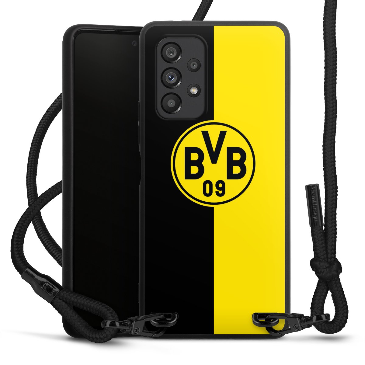 The matt black silicone case is made of flexible TPU (thermoplastic polyurethane) and offers robust protection. The durable, unbreakable material makes the cover flexible and dimensionally stable at the same time. The matte surface makes your design stand out more and is less susceptible to fingerprints and dirt. The stylish trend accessory fits comfortably in the hand and is perfectly complemented by the fabric (polyester) mobile phone strap. The braided fabric strap is approx. 1.70 metres long with a diameter of approx. 0.5 cm. Due to the special knotting technique, the length of the strap can be adjusted by simply pulling it, so that you can adapt it individually to your wishes. The practical case to wear around your neck is available with the fabric strap in black. As a little icing on the cake, we have provided the strap with a chic metal fastener in matt black. The strap is securely fastened to the case with loops made of high-quality genuine leather and press studs. The ends of the fabric strap are covered with metallic end caps and thus protected from fraying.