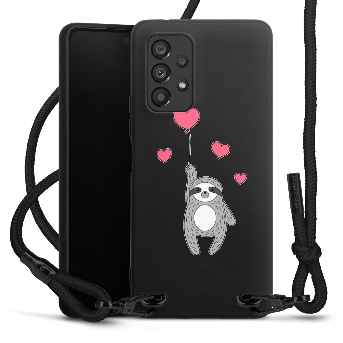 The matt black silicone case is made of flexible TPU (thermoplastic polyurethane) and offers robust protection. The durable, unbreakable material makes the cover flexible and dimensionally stable at the same time. The matte surface makes your design stand out more and is less susceptible to fingerprints and dirt. The stylish trend accessory fits comfortably in the hand and is perfectly complemented by the fabric (polyester) mobile phone strap. The braided fabric strap is approx. 1.70 metres long with a diameter of approx. 0.5 cm. Due to the special knotting technique, the length of the strap can be adjusted by simply pulling it, so that you can adapt it individually to your wishes. The practical case to wear around your neck is available with the fabric strap in black. As a little icing on the cake, we have provided the strap with a chic metal fastener in matt black. The strap is securely fastened to the case with loops made of high-quality genuine leather and press studs. The ends of the fabric strap are covered with metallic end caps and thus protected from fraying.