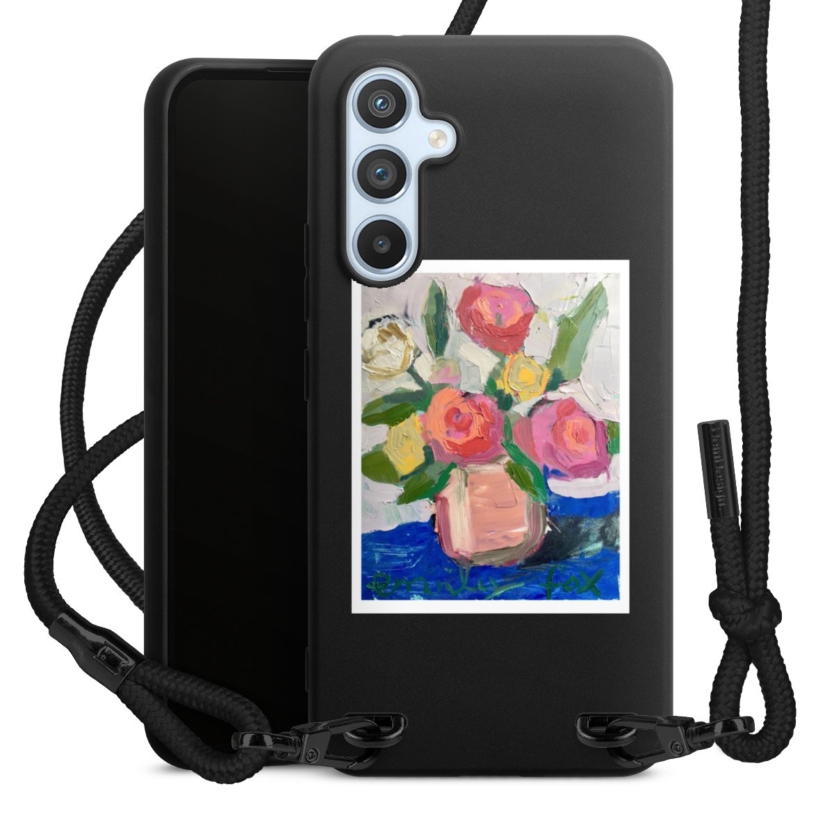 The matt black silicone case is made of flexible TPU (thermoplastic polyurethane) and offers robust protection. The durable, unbreakable material makes the cover flexible and dimensionally stable at the same time. The matte surface makes your design stand out more and is less susceptible to fingerprints and dirt. The stylish trend accessory fits comfortably in the hand and is perfectly complemented by the fabric (polyester) mobile phone strap. The braided fabric strap is approx. 1.70 metres long with a diameter of approx. 0.5 cm. Due to the special knotting technique, the length of the strap can be adjusted by simply pulling it, so that you can adapt it individually to your wishes. The practical case to wear around your neck is available with the fabric strap in black. As a little icing on the cake, we have provided the strap with a chic metal fastener in matt black. The strap is securely fastened to the case with loops made of high-quality genuine leather and press studs. The ends of the fabric strap are covered with metallic end caps and thus protected from fraying.