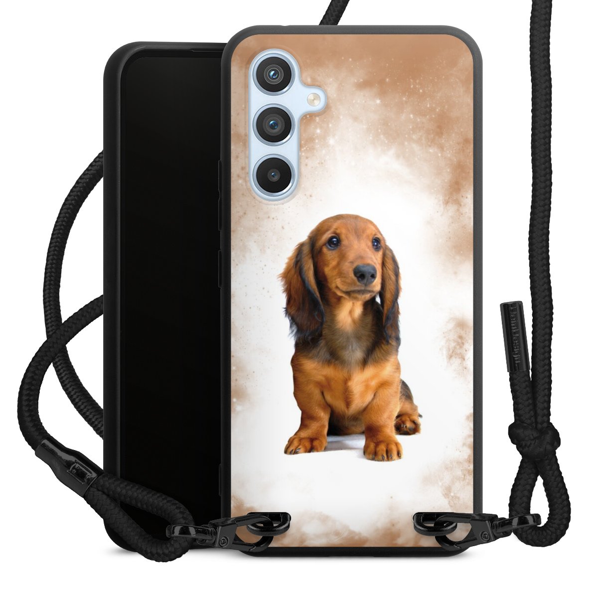 The matt black silicone case is made of flexible TPU (thermoplastic polyurethane) and offers robust protection. The durable, unbreakable material makes the cover flexible and dimensionally stable at the same time. The matte surface makes your design stand out more and is less susceptible to fingerprints and dirt. The stylish trend accessory fits comfortably in the hand and is perfectly complemented by the fabric (polyester) mobile phone strap. The braided fabric strap is approx. 1.70 metres long with a diameter of approx. 0.5 cm. Due to the special knotting technique, the length of the strap can be adjusted by simply pulling it, so that you can adapt it individually to your wishes. The practical case to wear around your neck is available with the fabric strap in black. As a little icing on the cake, we have provided the strap with a chic metal fastener in matt black. The strap is securely fastened to the case with loops made of high-quality genuine leather and press studs. The ends of the fabric strap are covered with metallic end caps and thus protected from fraying.