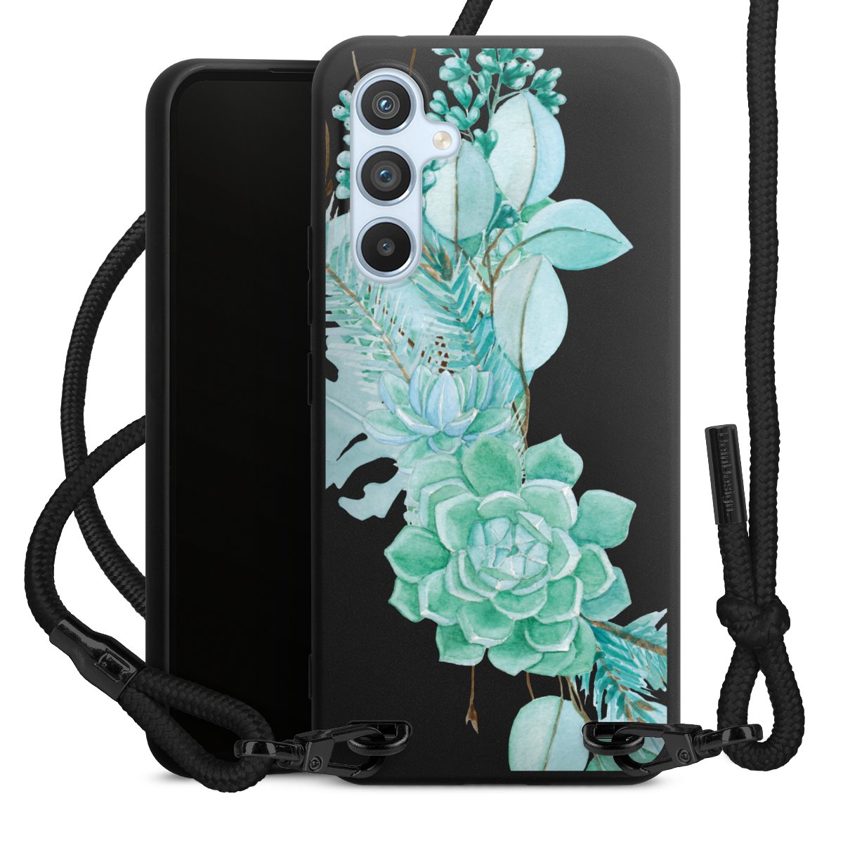 The matt black silicone case is made of flexible TPU (thermoplastic polyurethane) and offers robust protection. The durable, unbreakable material makes the cover flexible and dimensionally stable at the same time. The matte surface makes your design stand out more and is less susceptible to fingerprints and dirt. The stylish trend accessory fits comfortably in the hand and is perfectly complemented by the fabric (polyester) mobile phone strap. The braided fabric strap is approx. 1.70 metres long with a diameter of approx. 0.5 cm. Due to the special knotting technique, the length of the strap can be adjusted by simply pulling it, so that you can adapt it individually to your wishes. The practical case to wear around your neck is available with the fabric strap in black. As a little icing on the cake, we have provided the strap with a chic metal fastener in matt black. The strap is securely fastened to the case with loops made of high-quality genuine leather and press studs. The ends of the fabric strap are covered with metallic end caps and thus protected from fraying.