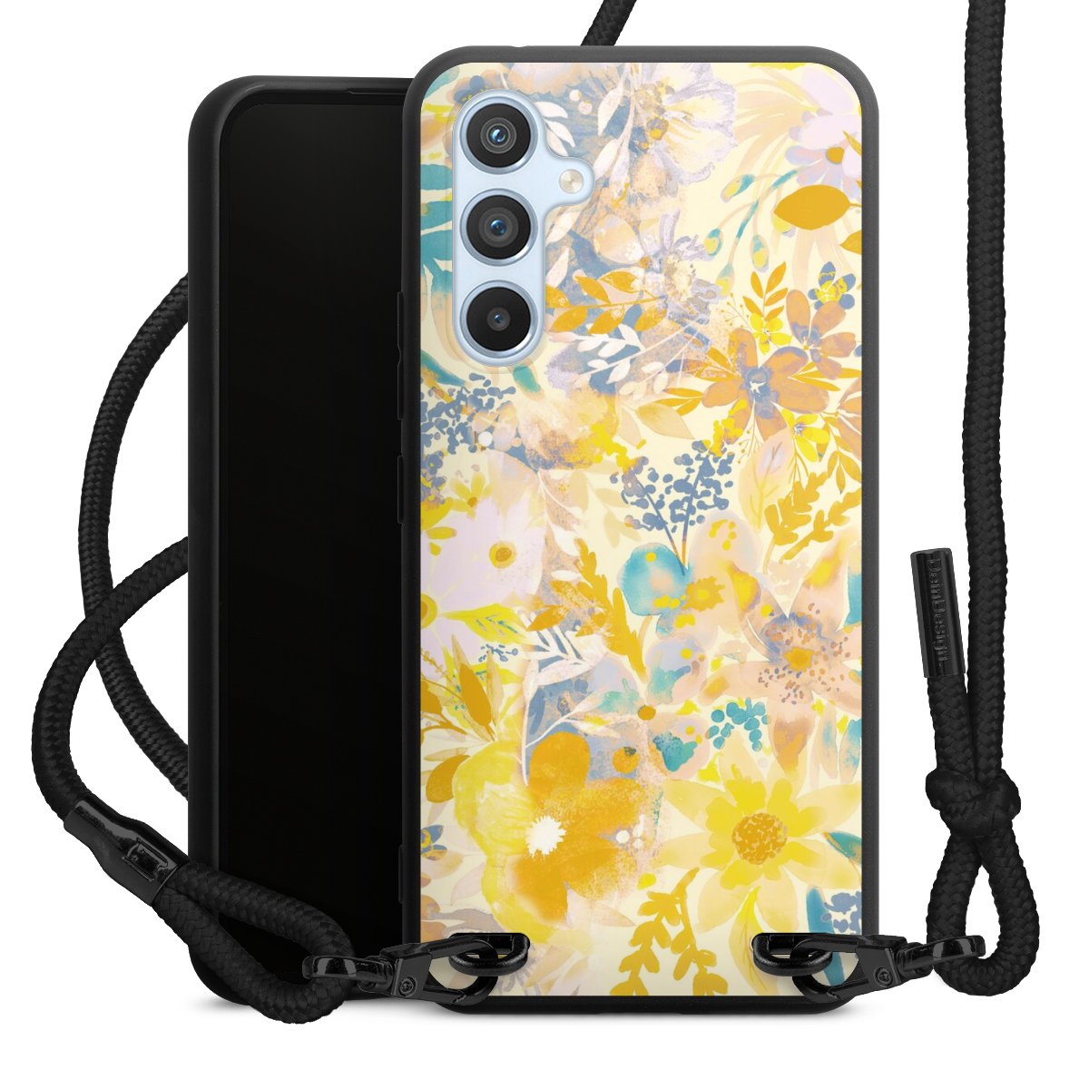 The matt black silicone case is made of flexible TPU (thermoplastic polyurethane) and offers robust protection. The durable, unbreakable material makes the cover flexible and dimensionally stable at the same time. The matte surface makes your design stand out more and is less susceptible to fingerprints and dirt. The stylish trend accessory fits comfortably in the hand and is perfectly complemented by the fabric (polyester) mobile phone strap. The braided fabric strap is approx. 1.70 metres long with a diameter of approx. 0.5 cm. Due to the special knotting technique, the length of the strap can be adjusted by simply pulling it, so that you can adapt it individually to your wishes. The practical case to wear around your neck is available with the fabric strap in black. As a little icing on the cake, we have provided the strap with a chic metal fastener in matt black. The strap is securely fastened to the case with loops made of high-quality genuine leather and press studs. The ends of the fabric strap are covered with metallic end caps and thus protected from fraying.