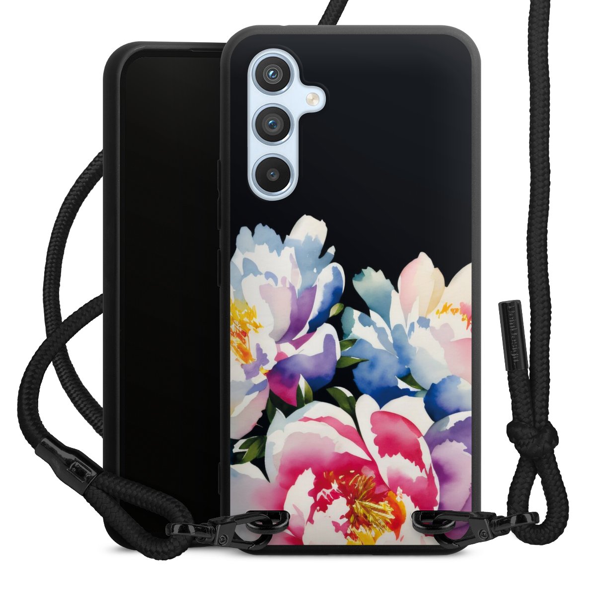 The matt black silicone case is made of flexible TPU (thermoplastic polyurethane) and offers robust protection. The durable, unbreakable material makes the cover flexible and dimensionally stable at the same time. The matte surface makes your design stand out more and is less susceptible to fingerprints and dirt. The stylish trend accessory fits comfortably in the hand and is perfectly complemented by the fabric (polyester) mobile phone strap. The braided fabric strap is approx. 1.70 metres long with a diameter of approx. 0.5 cm. Due to the special knotting technique, the length of the strap can be adjusted by simply pulling it, so that you can adapt it individually to your wishes. The practical case to wear around your neck is available with the fabric strap in black. As a little icing on the cake, we have provided the strap with a chic metal fastener in matt black. The strap is securely fastened to the case with loops made of high-quality genuine leather and press studs. The ends of the fabric strap are covered with metallic end caps and thus protected from fraying.
