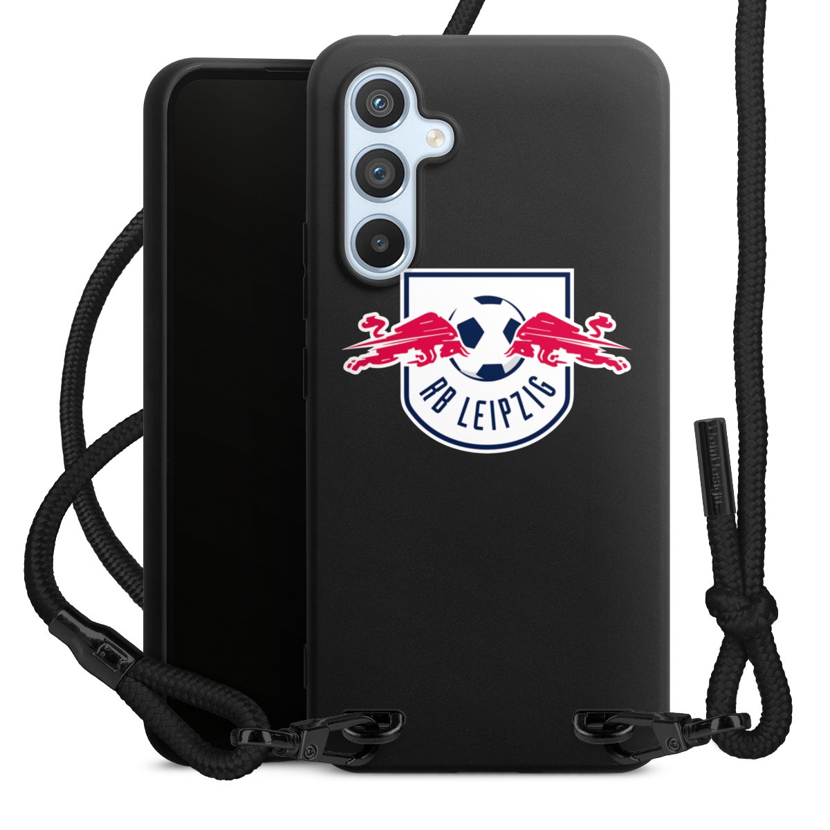 The matt black silicone case is made of flexible TPU (thermoplastic polyurethane) and offers robust protection. The durable, unbreakable material makes the cover flexible and dimensionally stable at the same time. The matte surface makes your design stand out more and is less susceptible to fingerprints and dirt. The stylish trend accessory fits comfortably in the hand and is perfectly complemented by the fabric (polyester) mobile phone strap. The braided fabric strap is approx. 1.70 metres long with a diameter of approx. 0.5 cm. Due to the special knotting technique, the length of the strap can be adjusted by simply pulling it, so that you can adapt it individually to your wishes. The practical case to wear around your neck is available with the fabric strap in black. As a little icing on the cake, we have provided the strap with a chic metal fastener in matt black. The strap is securely fastened to the case with loops made of high-quality genuine leather and press studs. The ends of the fabric strap are covered with metallic end caps and thus protected from fraying.