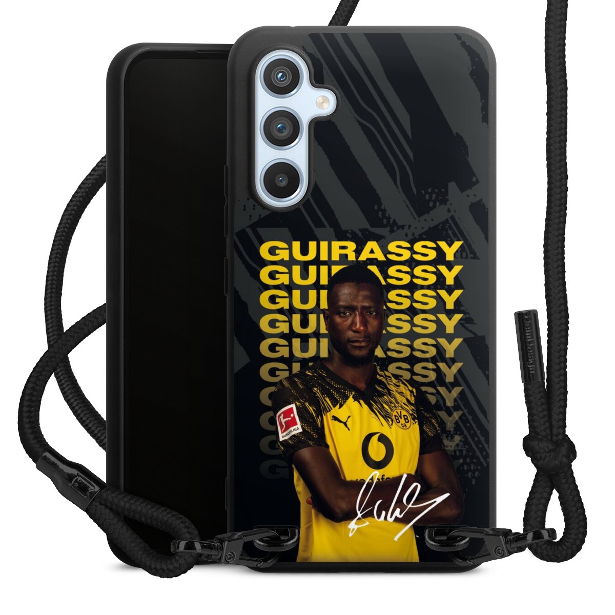 The matt black silicone case is made of flexible TPU (thermoplastic polyurethane) and offers robust protection. The durable, unbreakable material makes the cover flexible and dimensionally stable at the same time. The matte surface makes your design stand out more and is less susceptible to fingerprints and dirt. The stylish trend accessory fits comfortably in the hand and is perfectly complemented by the fabric (polyester) mobile phone strap. The braided fabric strap is approx. 1.70 metres long with a diameter of approx. 0.5 cm. Due to the special knotting technique, the length of the strap can be adjusted by simply pulling it, so that you can adapt it individually to your wishes. The practical case to wear around your neck is available with the fabric strap in black. As a little icing on the cake, we have provided the strap with a chic metal fastener in matt black. The strap is securely fastened to the case with loops made of high-quality genuine leather and press studs. The ends of the fabric strap are covered with metallic end caps and thus protected from fraying.