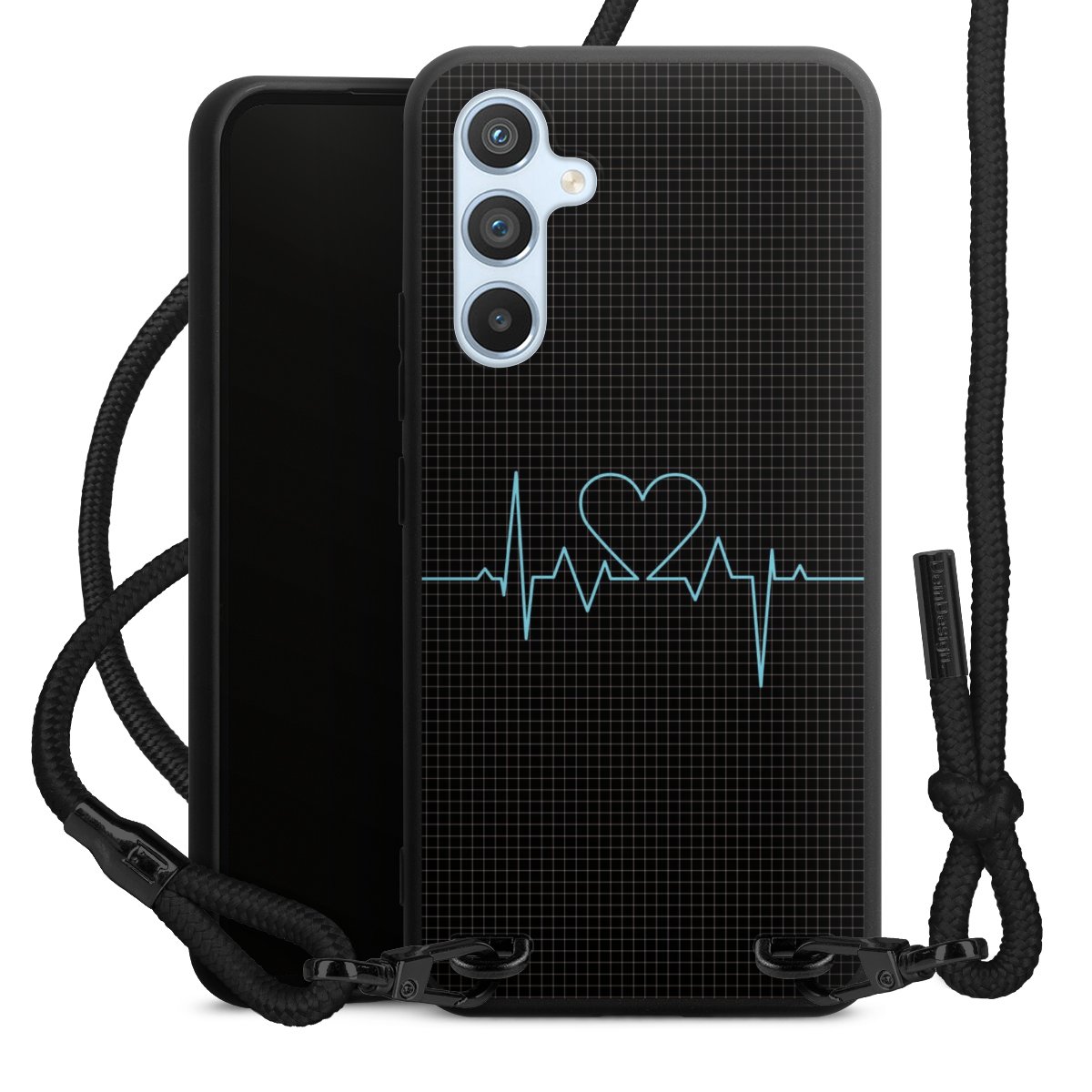 The matt black silicone case is made of flexible TPU (thermoplastic polyurethane) and offers robust protection. The durable, unbreakable material makes the cover flexible and dimensionally stable at the same time. The matte surface makes your design stand out more and is less susceptible to fingerprints and dirt. The stylish trend accessory fits comfortably in the hand and is perfectly complemented by the fabric (polyester) mobile phone strap. The braided fabric strap is approx. 1.70 metres long with a diameter of approx. 0.5 cm. Due to the special knotting technique, the length of the strap can be adjusted by simply pulling it, so that you can adapt it individually to your wishes. The practical case to wear around your neck is available with the fabric strap in black. As a little icing on the cake, we have provided the strap with a chic metal fastener in matt black. The strap is securely fastened to the case with loops made of high-quality genuine leather and press studs. The ends of the fabric strap are covered with metallic end caps and thus protected from fraying.