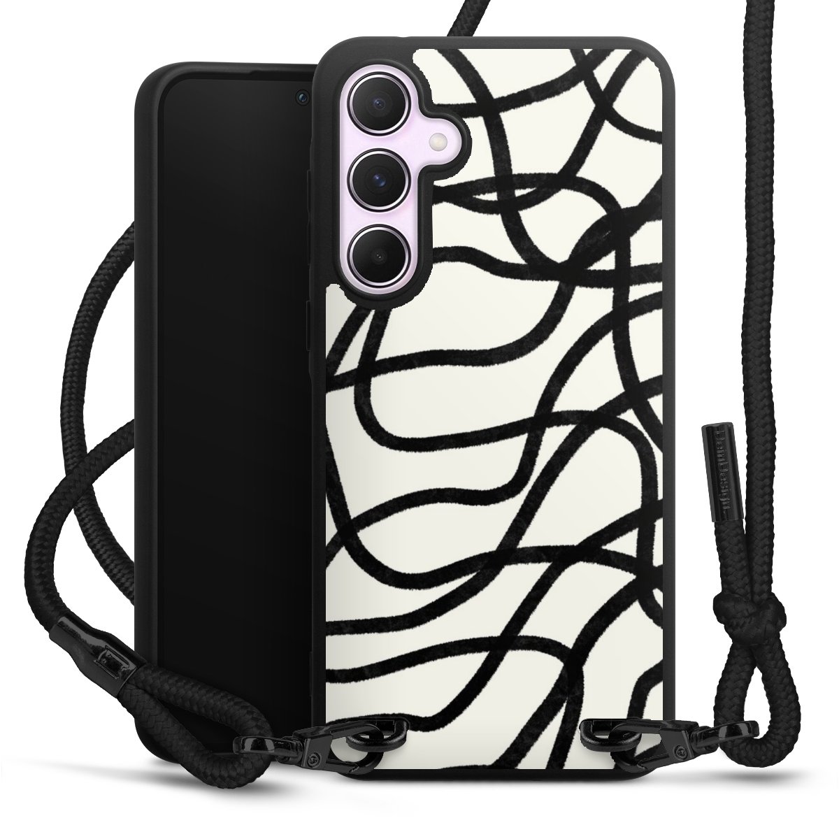 The matt black silicone case is made of flexible TPU (thermoplastic polyurethane) and offers robust protection. The durable, unbreakable material makes the cover flexible and dimensionally stable at the same time. The matte surface makes your design stand out more and is less susceptible to fingerprints and dirt. The stylish trend accessory fits comfortably in the hand and is perfectly complemented by the fabric (polyester) mobile phone strap. The braided fabric strap is approx. 1.70 metres long with a diameter of approx. 0.5 cm. Due to the special knotting technique, the length of the strap can be adjusted by simply pulling it, so that you can adapt it individually to your wishes. The practical case to wear around your neck is available with the fabric strap in black. As a little icing on the cake, we have provided the strap with a chic metal fastener in matt black. The strap is securely fastened to the case with loops made of high-quality genuine leather and press studs. The ends of the fabric strap are covered with metallic end caps and thus protected from fraying.
