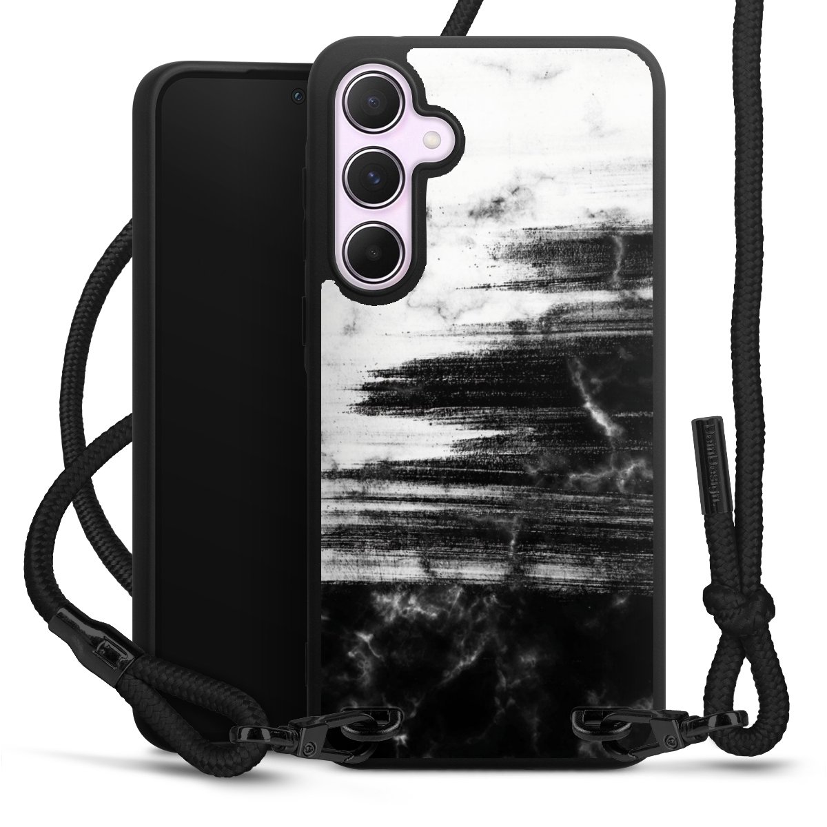 Pure Black: Phone case, fabric strap and metal details in stylish matt black.