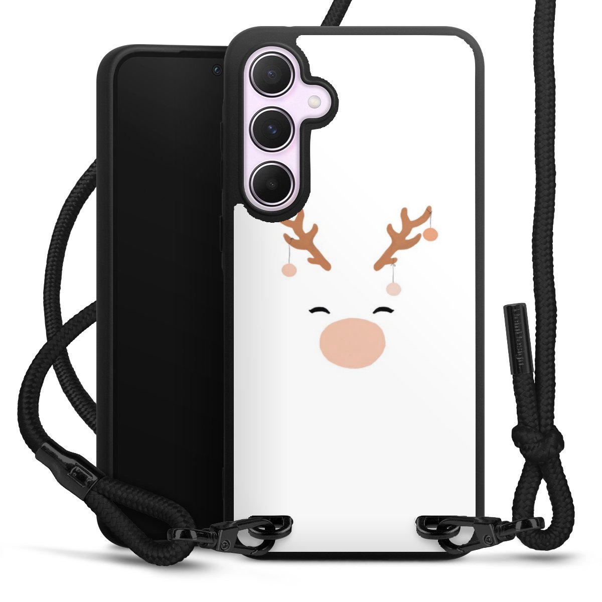The matt black silicone case is made of flexible TPU (thermoplastic polyurethane) and offers robust protection. The durable, unbreakable material makes the cover flexible and dimensionally stable at the same time. The matte surface makes your design stand out more and is less susceptible to fingerprints and dirt. The stylish trend accessory fits comfortably in the hand and is perfectly complemented by the fabric (polyester) mobile phone strap. The braided fabric strap is approx. 1.70 metres long with a diameter of approx. 0.5 cm. Due to the special knotting technique, the length of the strap can be adjusted by simply pulling it, so that you can adapt it individually to your wishes. The practical case to wear around your neck is available with the fabric strap in black. As a little icing on the cake, we have provided the strap with a chic metal fastener in matt black. The strap is securely fastened to the case with loops made of high-quality genuine leather and press studs. The ends of the fabric strap are covered with metallic end caps and thus protected from fraying.