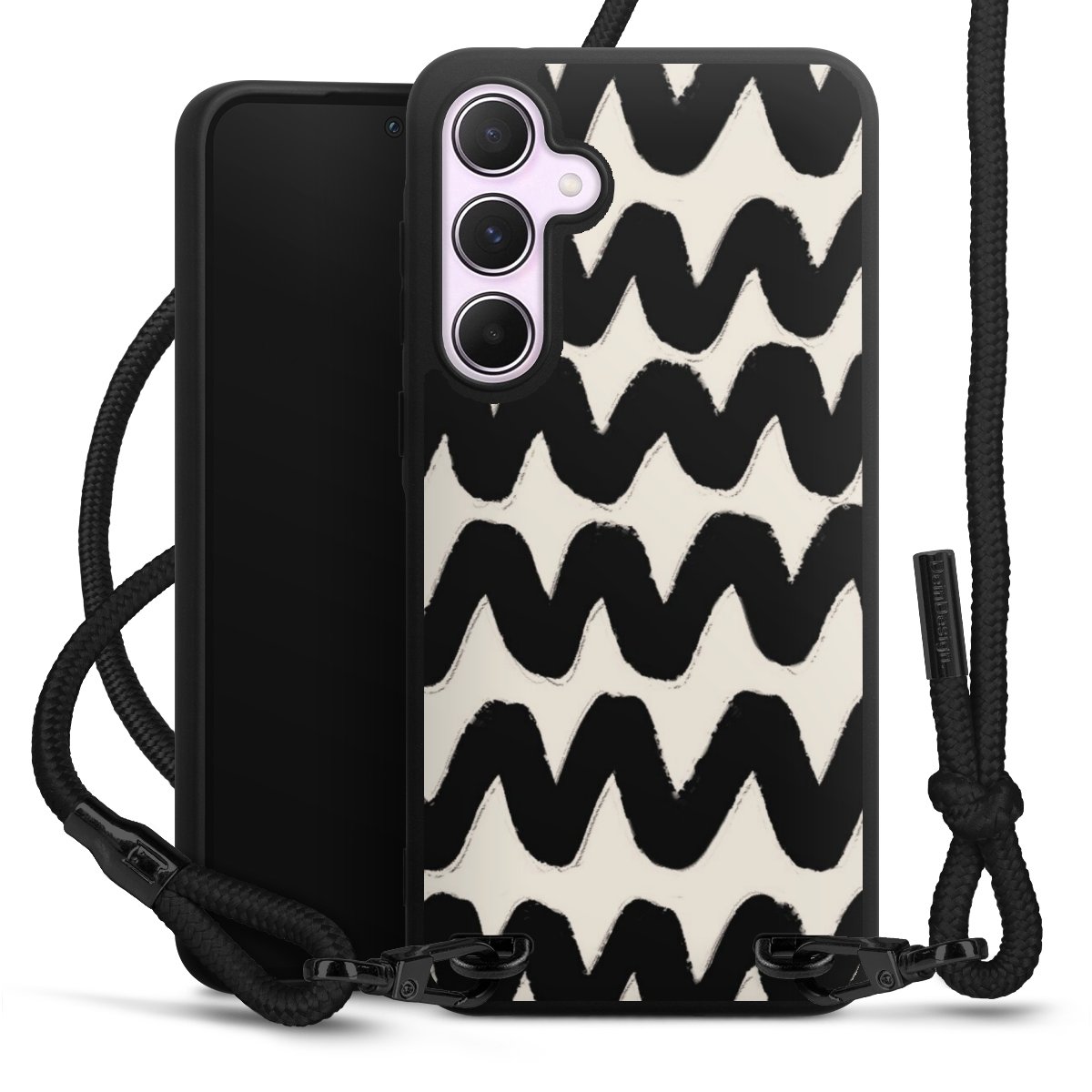 The matt black silicone case is made of flexible TPU (thermoplastic polyurethane) and offers robust protection. The durable, unbreakable material makes the cover flexible and dimensionally stable at the same time. The matte surface makes your design stand out more and is less susceptible to fingerprints and dirt. The stylish trend accessory fits comfortably in the hand and is perfectly complemented by the fabric (polyester) mobile phone strap. The braided fabric strap is approx. 1.70 metres long with a diameter of approx. 0.5 cm. Due to the special knotting technique, the length of the strap can be adjusted by simply pulling it, so that you can adapt it individually to your wishes. The practical case to wear around your neck is available with the fabric strap in black. As a little icing on the cake, we have provided the strap with a chic metal fastener in matt black. The strap is securely fastened to the case with loops made of high-quality genuine leather and press studs. The ends of the fabric strap are covered with metallic end caps and thus protected from fraying.