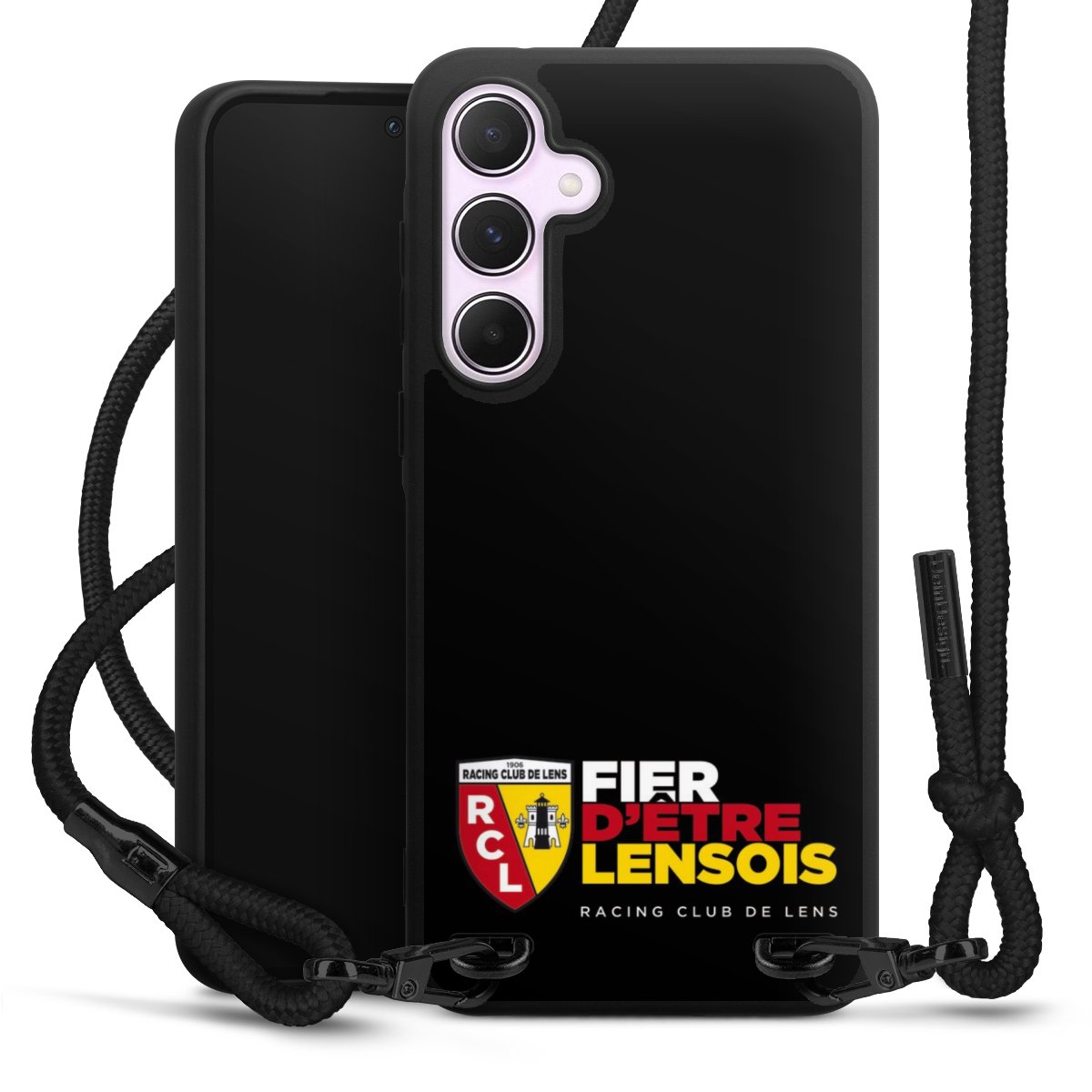The matt black silicone case is made of flexible TPU (thermoplastic polyurethane) and offers robust protection. The durable, unbreakable material makes the cover flexible and dimensionally stable at the same time. The matte surface makes your design stand out more and is less susceptible to fingerprints and dirt. The stylish trend accessory fits comfortably in the hand and is perfectly complemented by the fabric (polyester) mobile phone strap. The braided fabric strap is approx. 1.70 metres long with a diameter of approx. 0.5 cm. Due to the special knotting technique, the length of the strap can be adjusted by simply pulling it, so that you can adapt it individually to your wishes. The practical case to wear around your neck is available with the fabric strap in black. As a little icing on the cake, we have provided the strap with a chic metal fastener in matt black. The strap is securely fastened to the case with loops made of high-quality genuine leather and press studs. The ends of the fabric strap are covered with metallic end caps and thus protected from fraying.